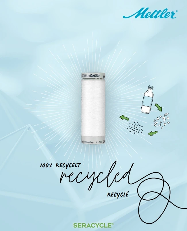 Das recycelte Nähgarn SERACYCLE aus 100% Post-Consumer recycelten PET-Flaschen ist der ideale Allrounder für das Fertigen ressourcenbewusster Nähprojekte – alles in gewohnter Mettler Qualität!