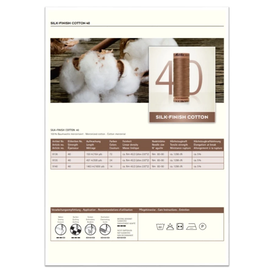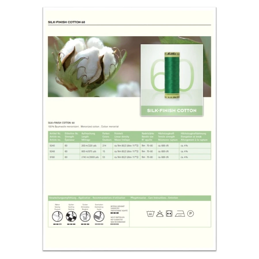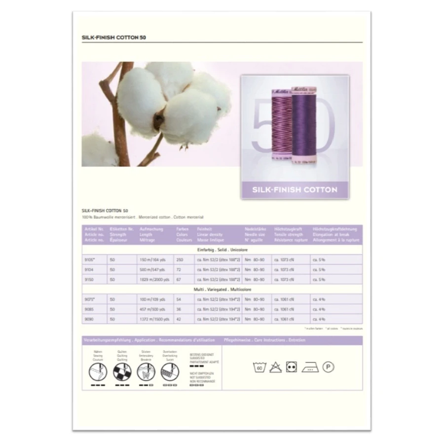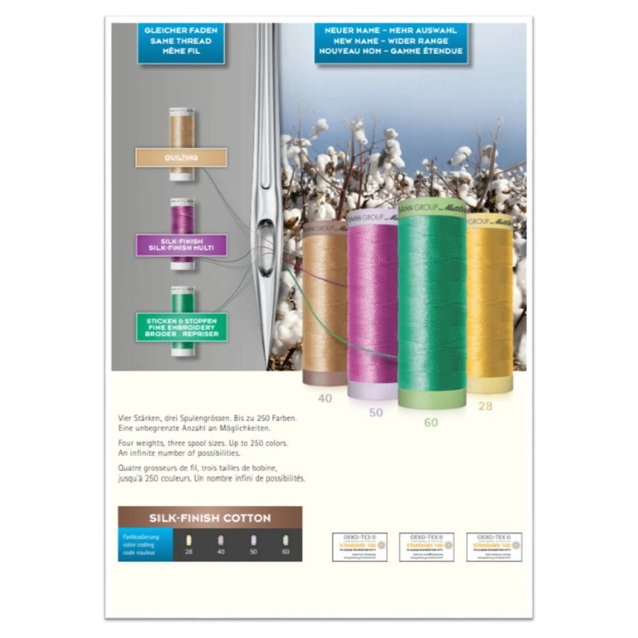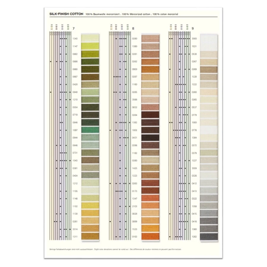 Die Farbkarte enthält Garn-Abschnitte von 250 Silk-Finish Cotton-Farben und 58 Silk-Finish Cotton-Multicolor-Farben, sowie zusätzliche Informationen zur Garnqualität und Anwendungsgebiete der Garne.