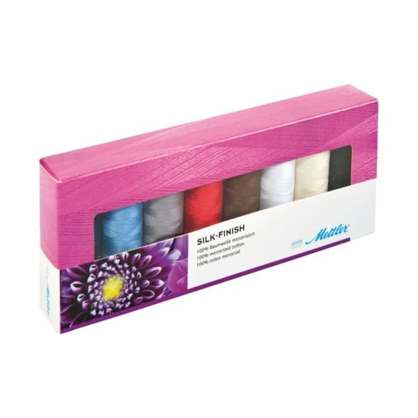 Das „SFC28-Kit“ beinhaltet 8 wunderschöne Farbtöne, die jeweils eine Aufmachung über 150m haben. Dieses tolle Fadenset ist mit der SILK-FINISH COTTON 50 bestückt, welches ein perfekter Näh, Quilt- und Stickfaden für feinste Baumwoll-Kreationen ist.