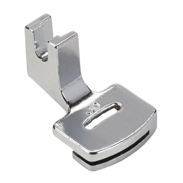 Da seine Sohle auf dem Transporteur nicht eben aufliegt, transportiert der Kräuselfuß den Stoff ungleichmäßig. Dadurch entsteht beim Nähen ein attraktiver Kräuseleffekt.