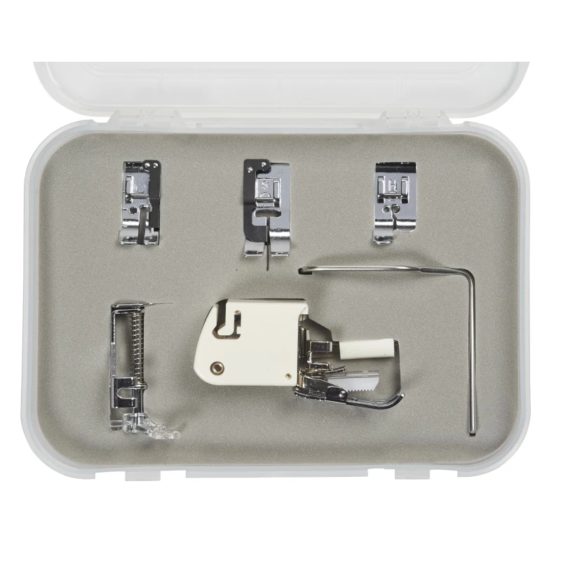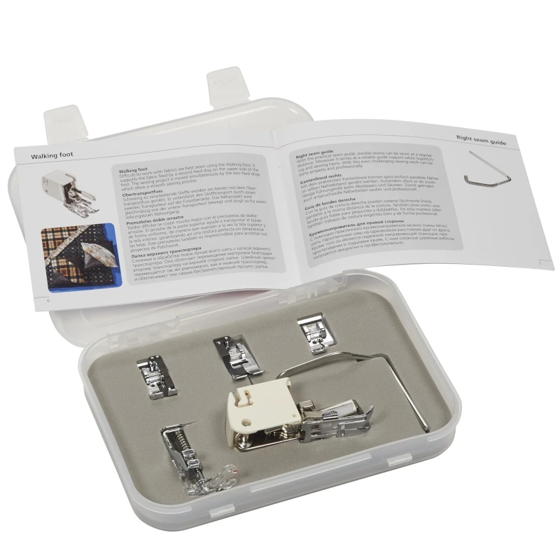 Das Quilting Nähfuß-Set für die Bernette b37 und B38 enthält fünf Nähfüße und ein Kantenlineal.