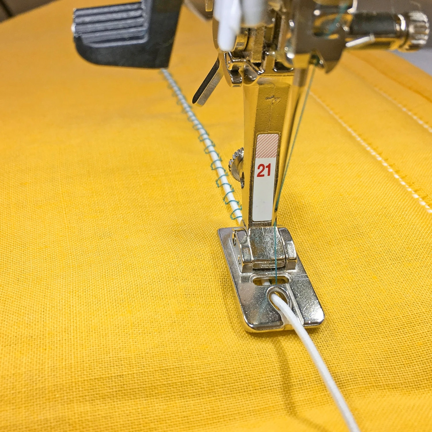 Durch ein abgeschrägtes Loch für Schnüre und Garne mit einem Durchmesser bis zu 3 mm gelingt mit dem Schnuraufnähfuß Nr. 21 ein gleichmäßiges, sauberes Nähen.