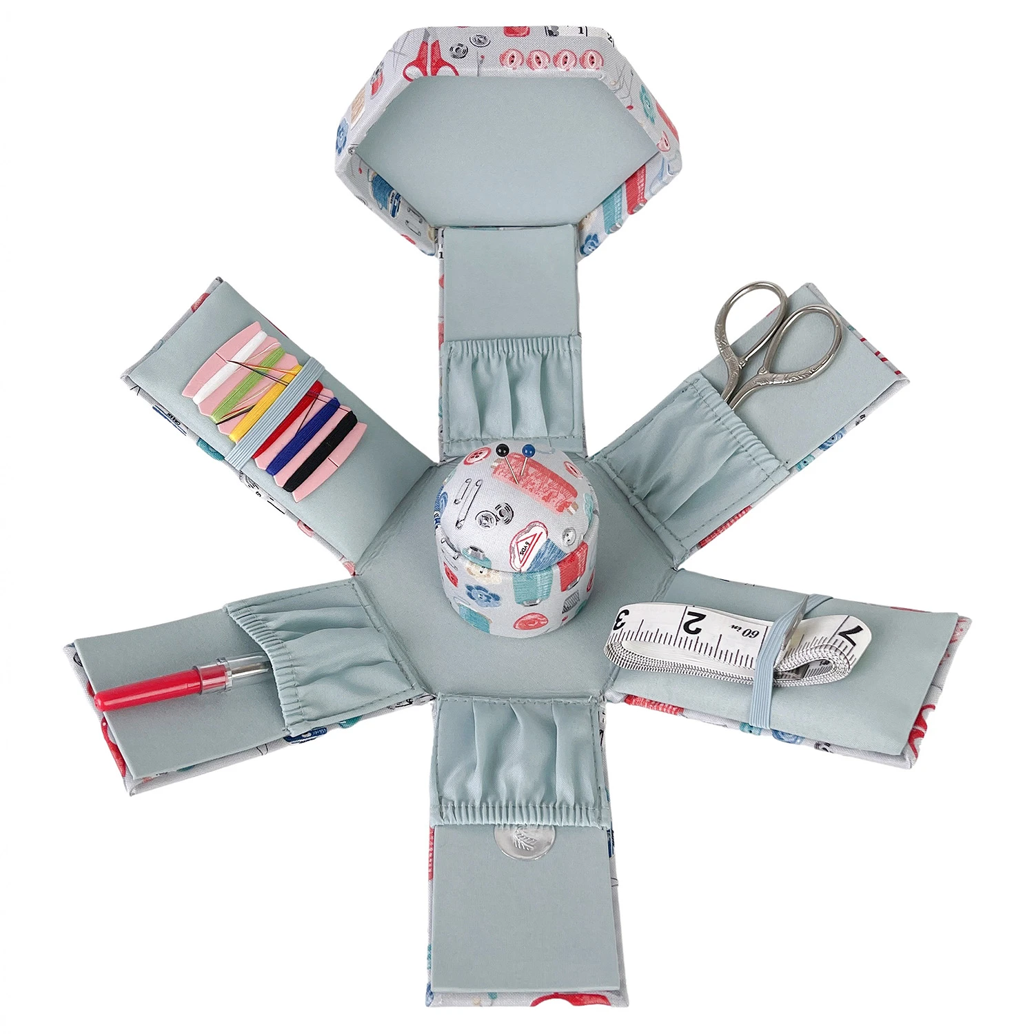Ein praktisches Nadelkästchen mit schönem Baumwollstoff in blaugrau / rot / türkis mit Nähzubehör-Design gestaltet, wer möchte damit nicht in das schöne Näh-Hobby starten?