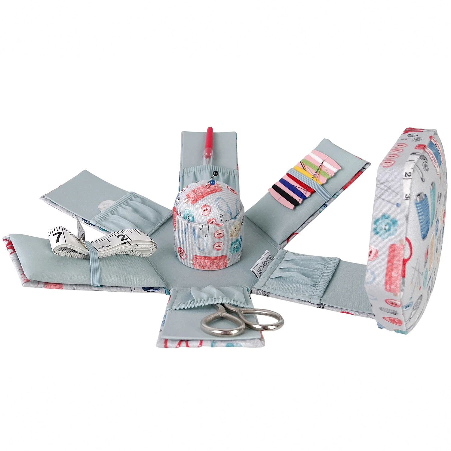 - Farbe: blaugrau / rot / türkis mit Nähzubehör-Design