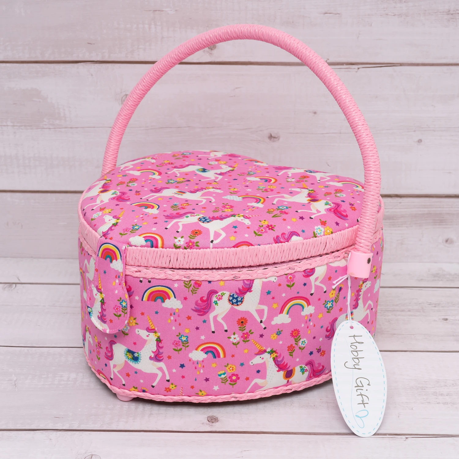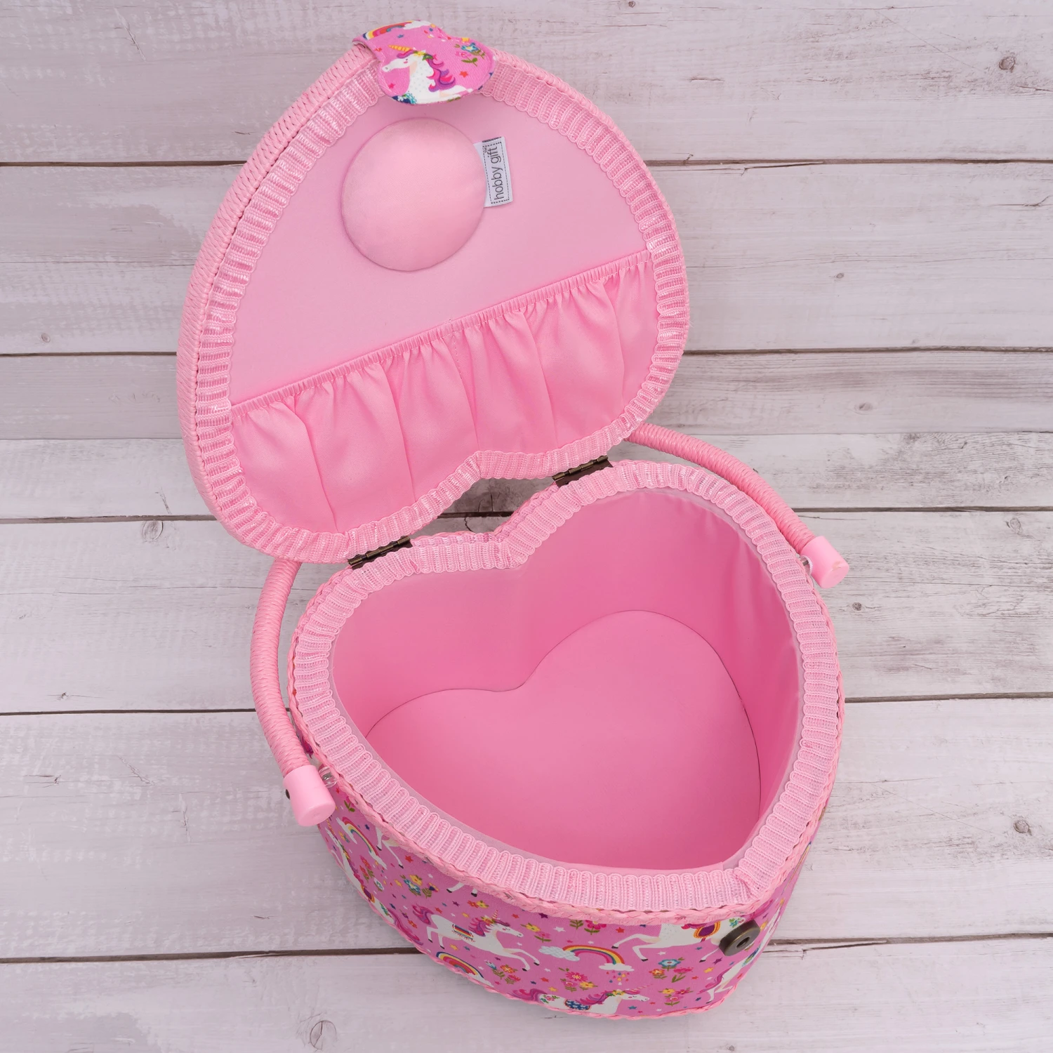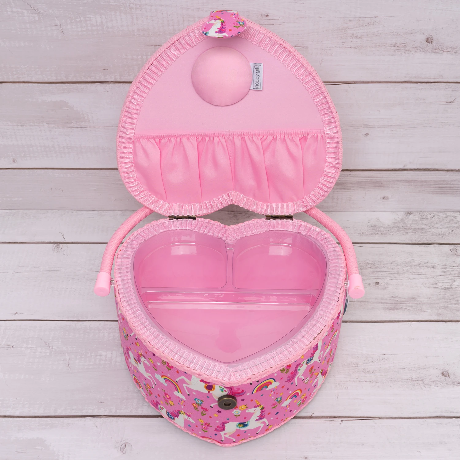 Der hochwertiger 2 tlg. Nähkasten in Herzform, ist mit einem Baumwollstoff in pink, mit bezauberndem Einhorn „Magical“ Design gestaltet.