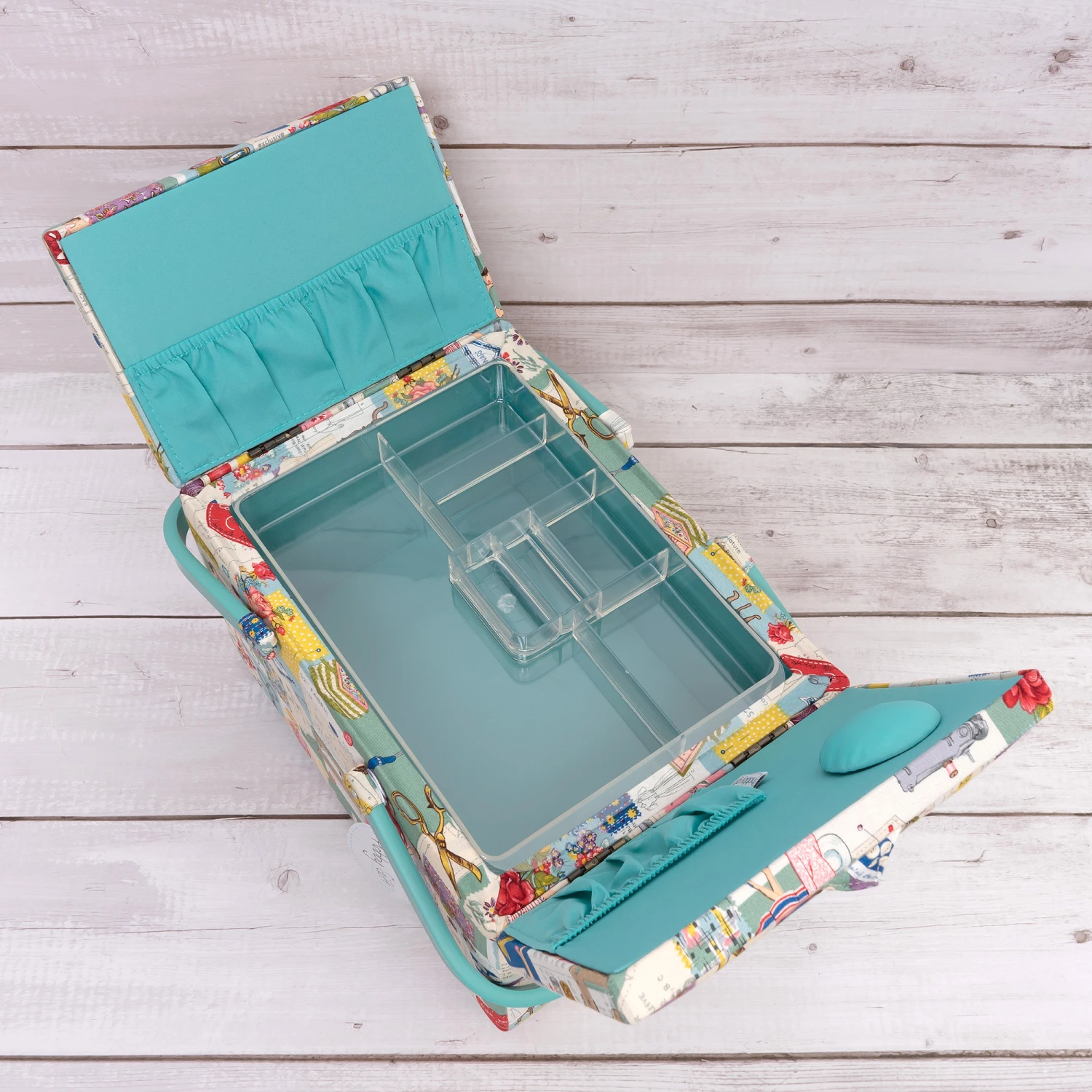 Der hochwertiger 2 tlg. Nähkasten ist mit einem Baumwollstoff in hellen türkis Farbtönen mit „Retro-Design“ gestaltet.