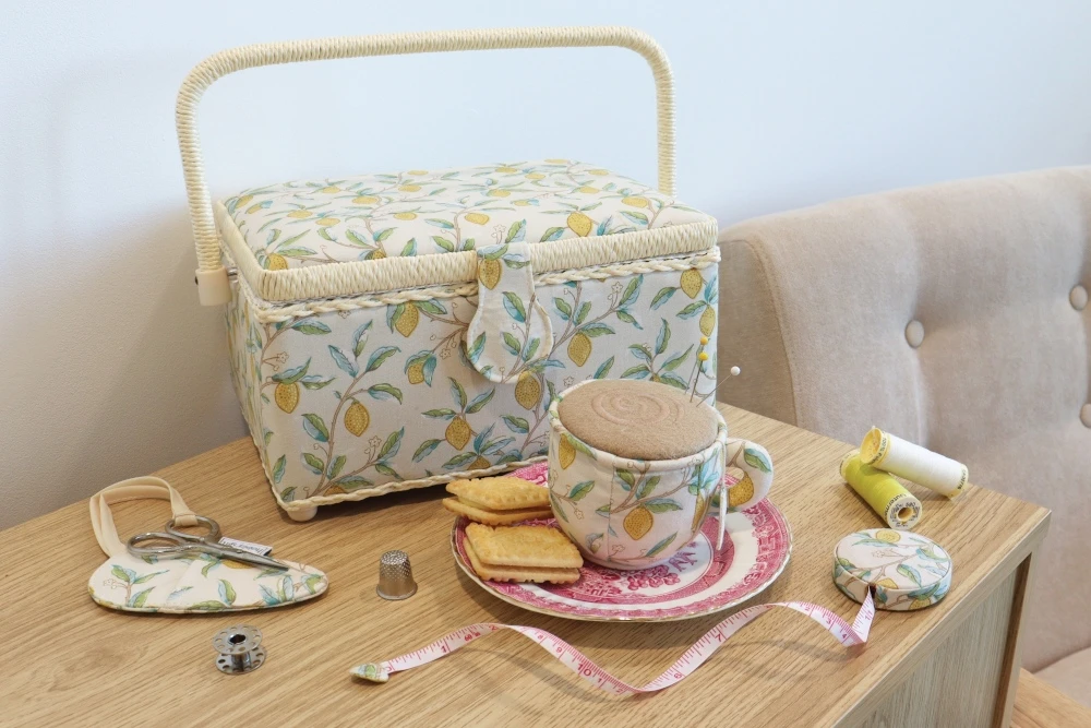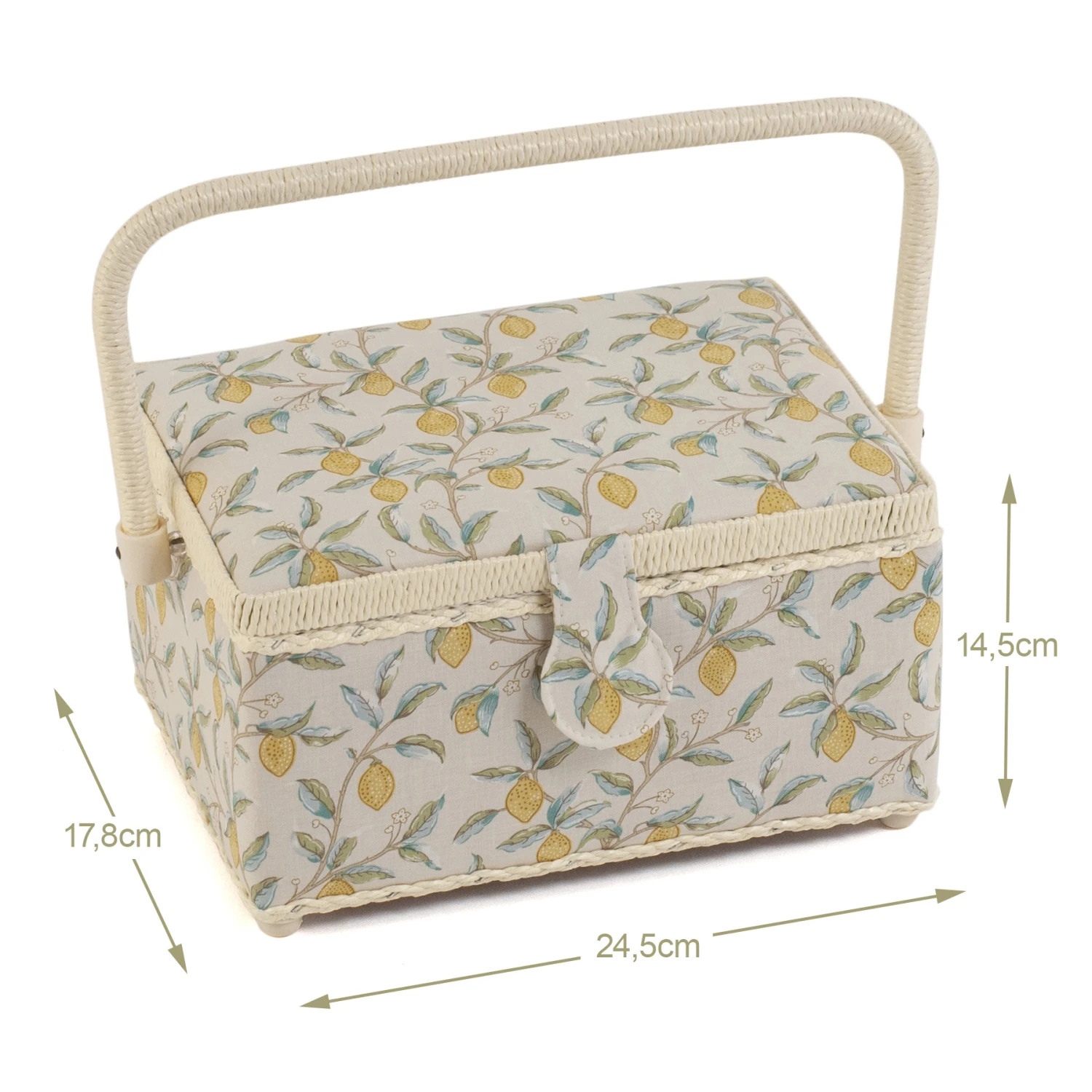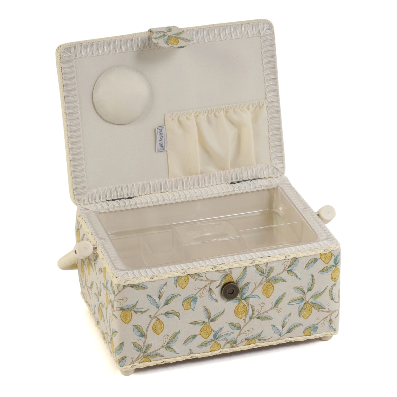 Der hochwertiger 2-tlg. Nähkasten ist mit einem Baumwollstoff in einem creme Farbton mit „Zitronen“ Design gestaltet.