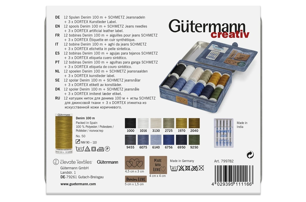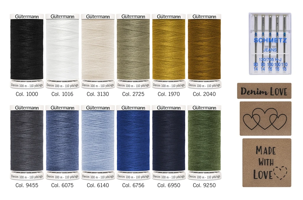 Gütermann Denim Box mit Jeansnadeln Lederetiketten No.50 (12 Farben/ 100 m)