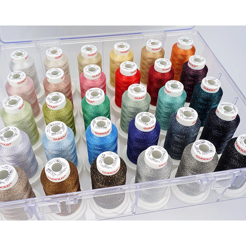 In der transparenten Garnbox sind 30 Rollen POLY SPARKLE enthalten.
