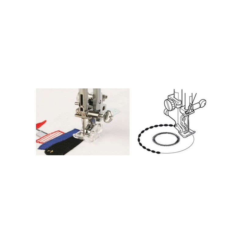 Dieser durchsichtige Kunststoff-Fuß ermöglicht eine gute Sicht auf das Nähgut. Er ist kürzer als andere Nähfüße, das erleichtert das Nähen um Kurven oder Ecken bei Applikationen.
