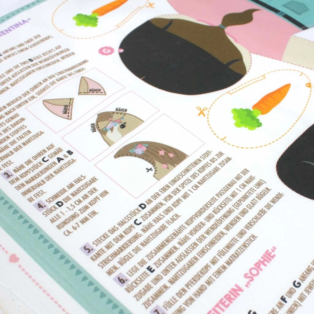 | Die Schnittteile sind bereits auf dem hochwertigen Baumwoll-Stoff aufgedruckt inkl. Nahtzugaben und Anleitung | |