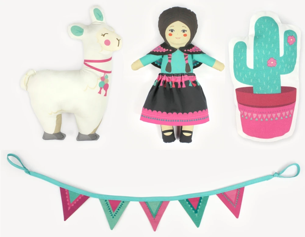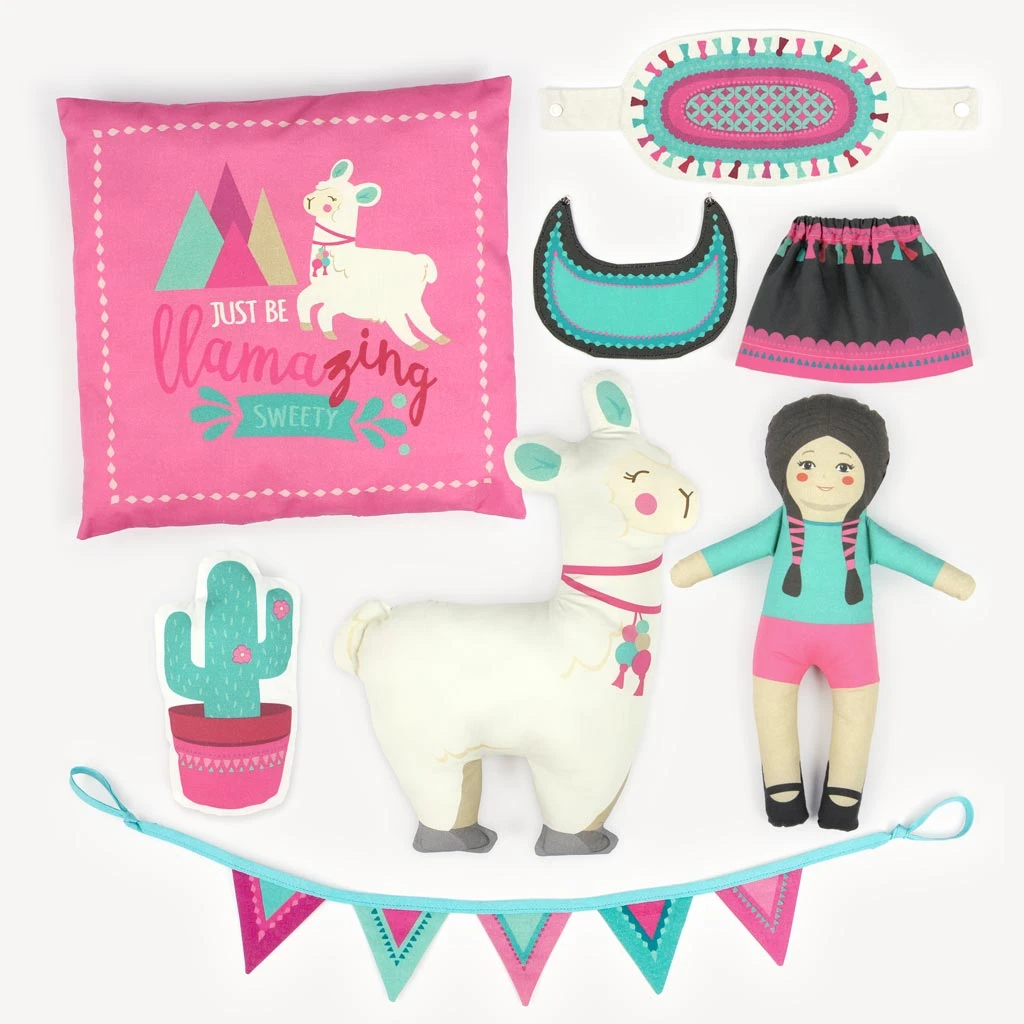 | Stoffpuppe „„ELENA““, Rock für Puppe, Poncho für Puppe, Kissen „JUST BE LLAMAZING“, Kaktus, Lama „LALA“, Satteldecke für Lama, Wimpelkette | |