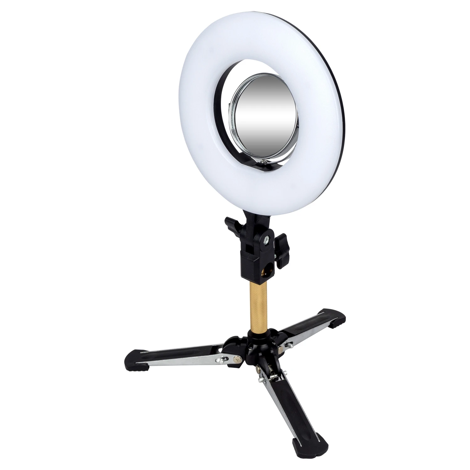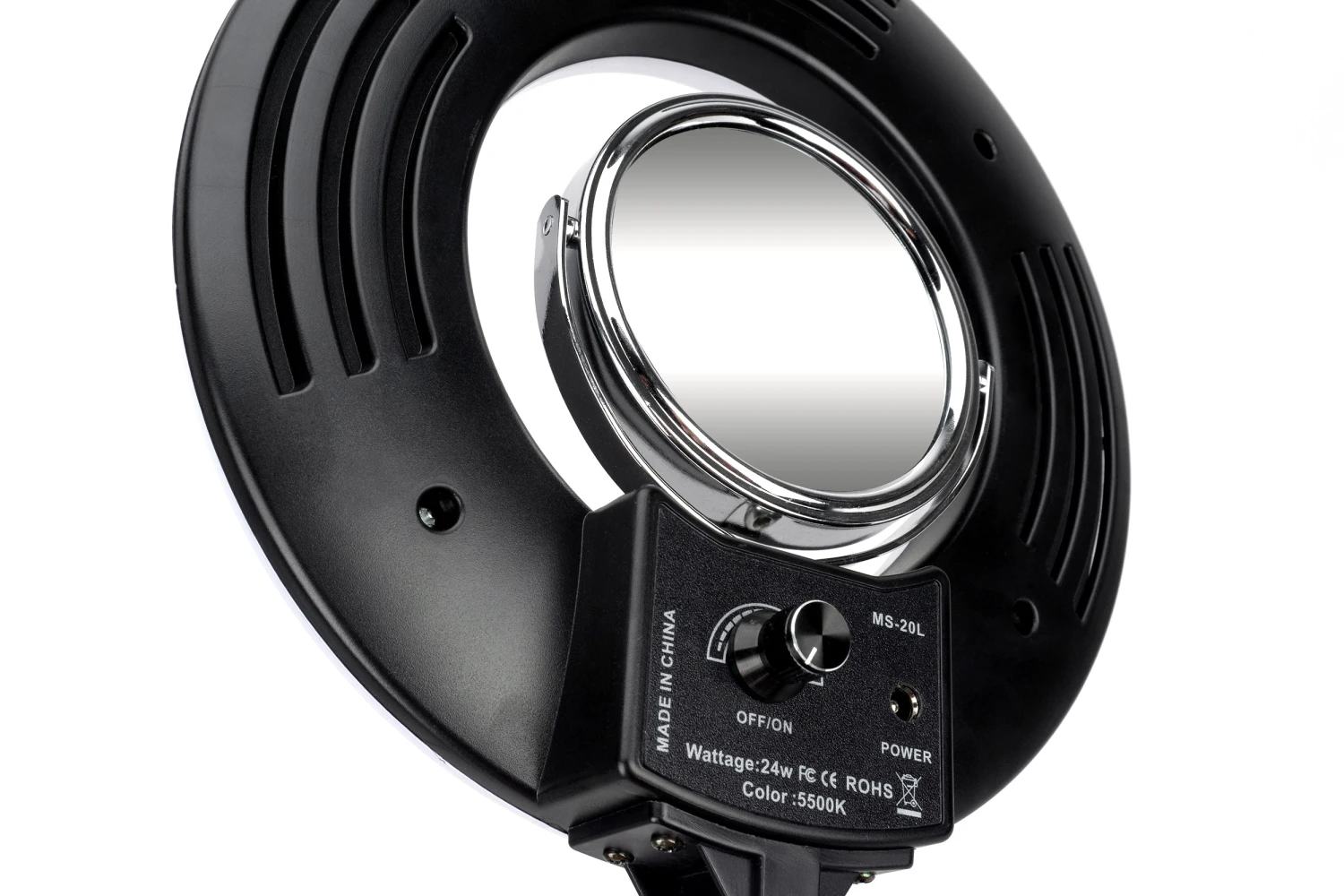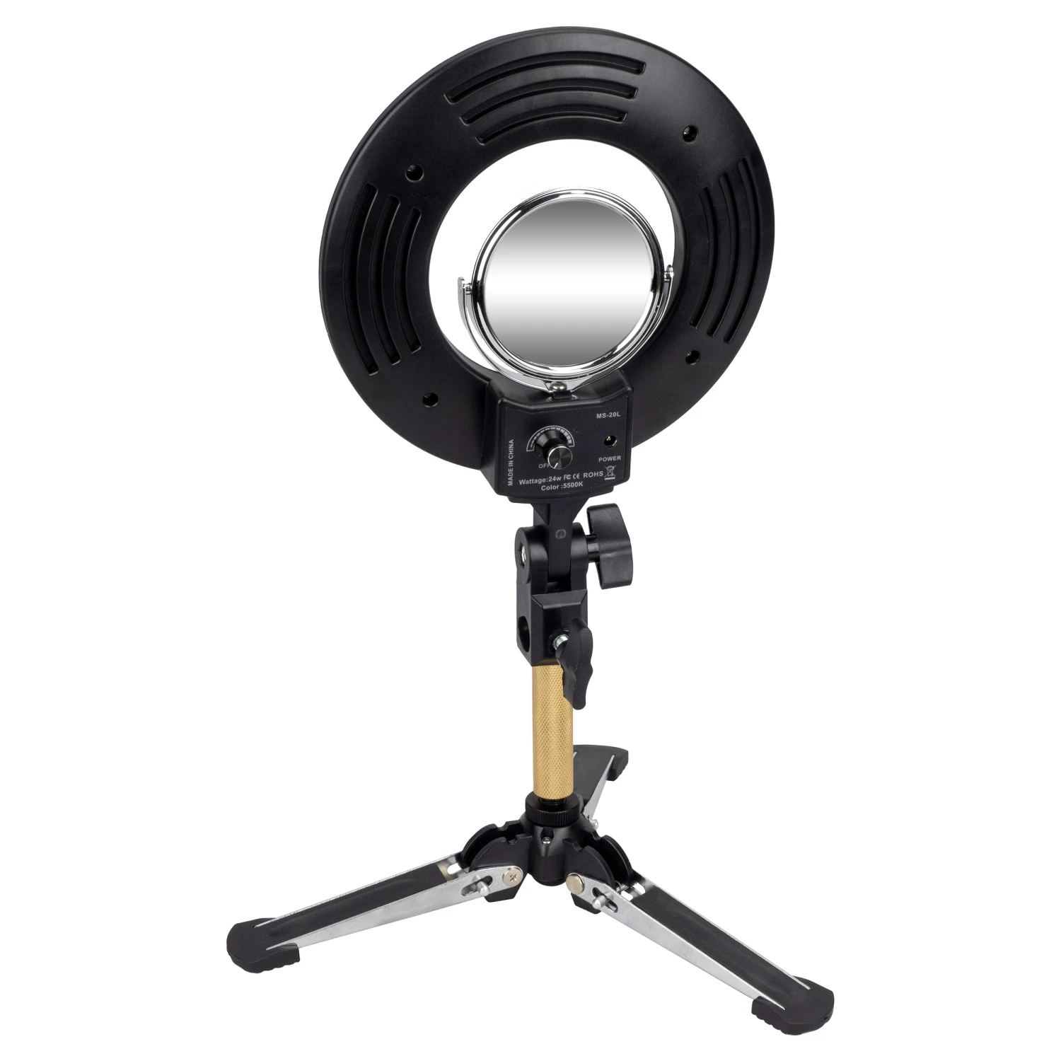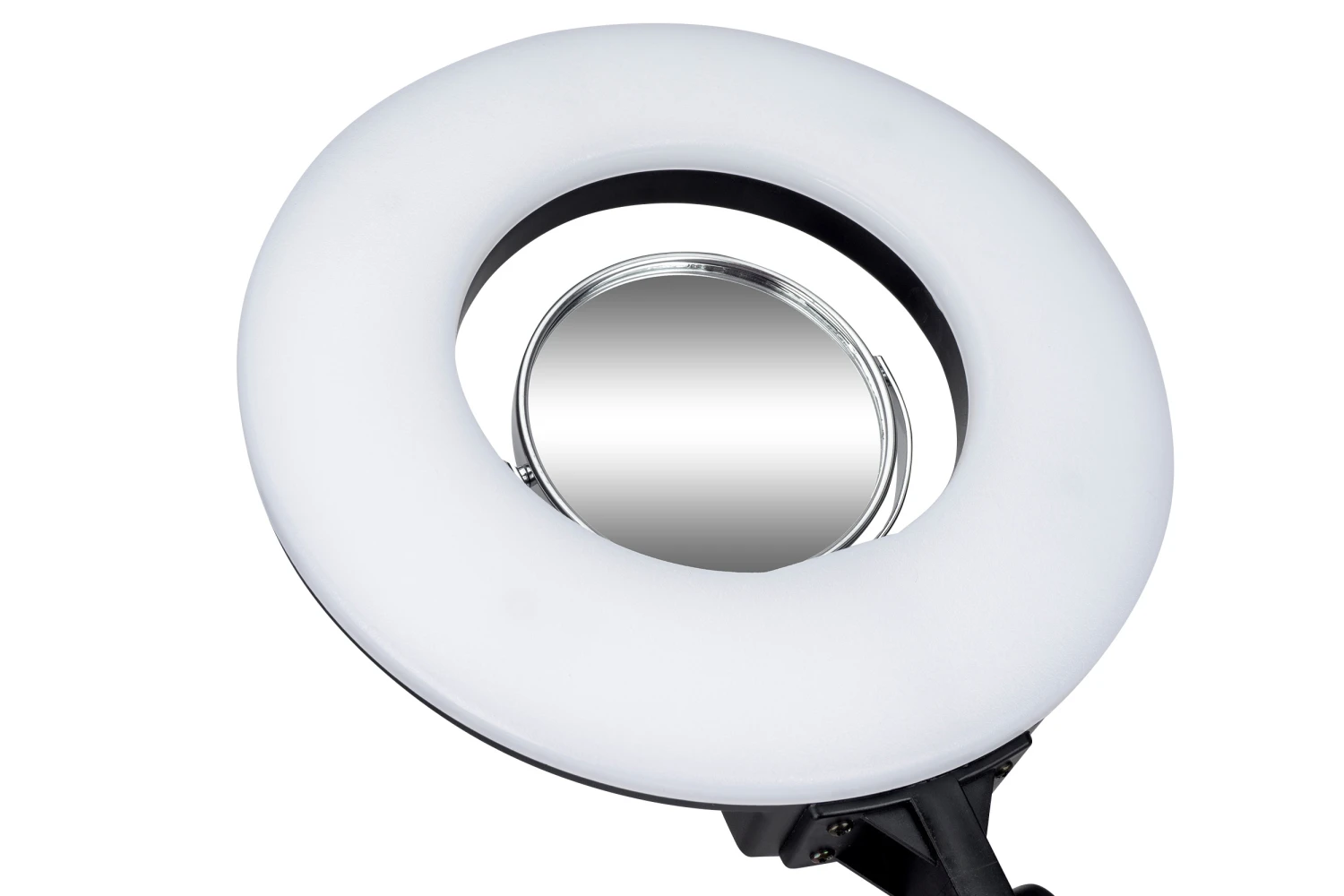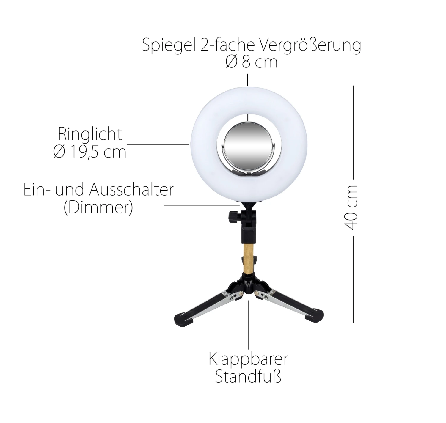 EIGENSCHAFTEN: Tisch-Stativ Höhe 40 cm, LED Ringlicht Ø 19,5 cm, Spiegel 2-fache Vergrößerung, Ø 8 cm, 9601LED-8 DIMMING 100-240V~, 50Hz/60Hz, 24W Power: 120PCS LED 2016LUX, 5500K,EU plug Diameter:8″(203 mm), inkl. Netzteil und Tasche