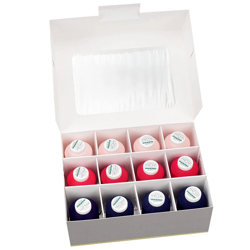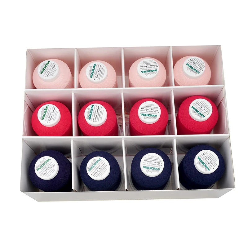 Die meist verkauften Hauptfarben des beliebten Aerolock No.125 Premium Overlockgarns und das Aeroflock No.100 Bauschgarn gibt es ab sofort als 1.200 m/ 1000m Miniking Konen, zusammengefasst in einer kompakten Schachtel mit insgesamt 9 Konen Aerolock No.125 und 3 Konen Aeroflock No. 100 Bauschgarn in rosa, pink, dunkelblau: diese Trendfarben braucht man immer und sollten in keiner Nähstube fehlen.