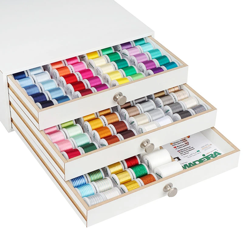 Die Garnschatulle ist komplett gefüllt und bietet Platz für die gesamte Farbkollektion Ihres bevorzugten Madeira Garns. Sie ist in drei herausnehmbaren Schubladen angeordnet und jede Farbe hat ihren eigenen Platzhalter mit Farbnummer und Farberkennung. Das macht das Ergänzen und Nachfüllen Ihrer persönlichen Garnschatulle sehr übersichtlich. Ihre Garne sind jederzeit griffbereit und vor Licht, Staub und Verschmutzung geschützt.