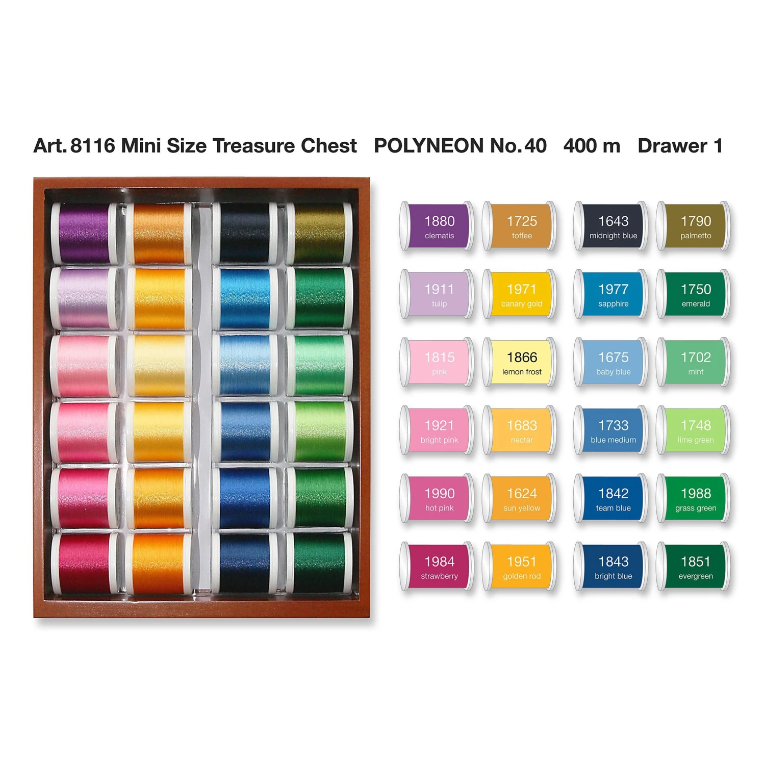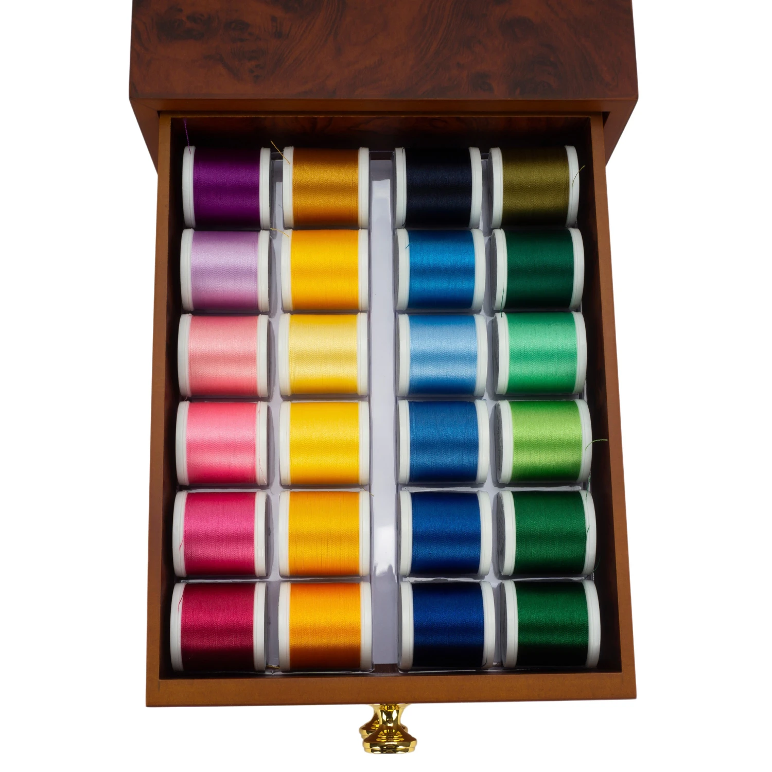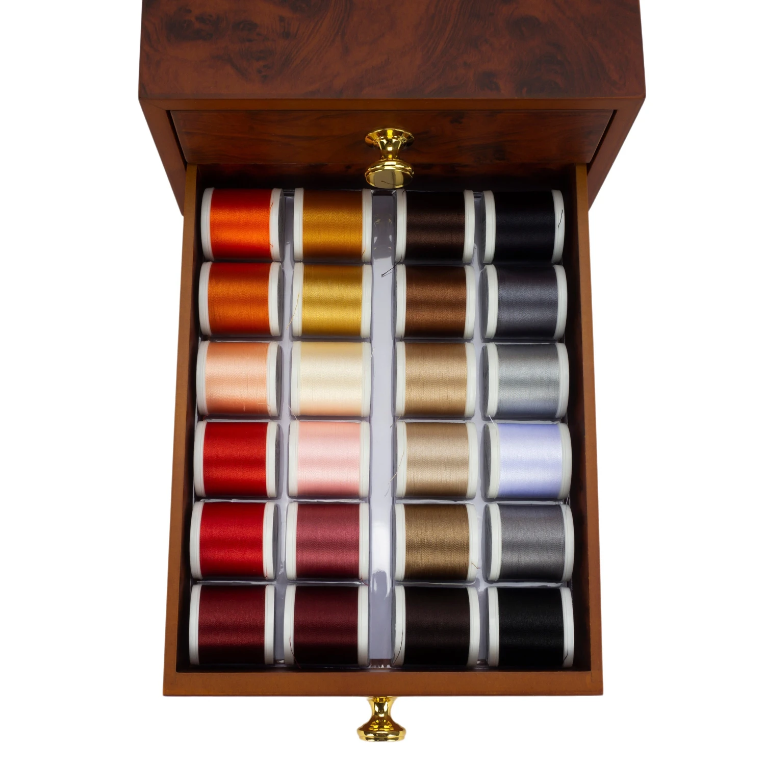 Die Garnschatulle ist komplett gefüllt und bietet Platz für die gesamte Farbkollektion Ihres bevorzugten Madeira Garns. Sie ist in drei herausnehmbaren Schubladen angeordnet und jede Farbe hat ihren eigenen Platzhalter mit Farbnummer und Farberkennung. Das macht das Ergänzen und Nachfüllen Ihrer persönlichen Garnschatulle sehr übersichtlich. Ihre Garne sind jederzeit griffbereit und vor Licht, Staub und Verschmutzung geschützt.
