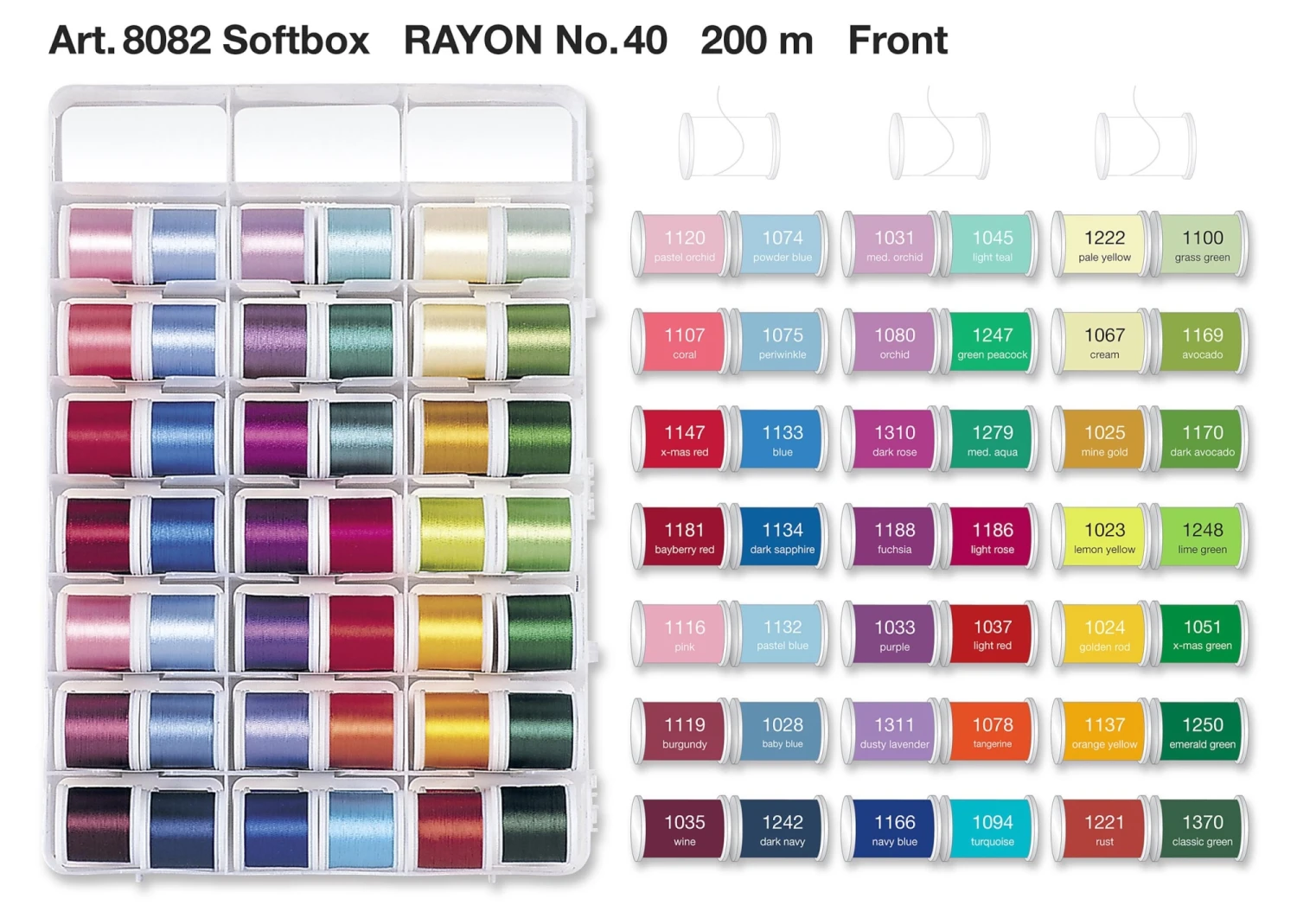 Hohe Reißfestigkeit, Farbechtheit und eine nahezu jeden Wunsch abdeckende Farbauswahl zeichnen Rayon No. 40 aus. Es wird aus hochfester Viskose hergestellt, ist bis 95° C waschbar und kann auf allen Geweben, selbst auf Jeans oder Leder verstickt werden.
