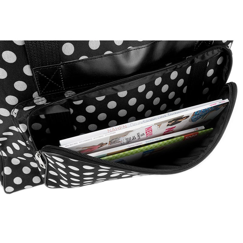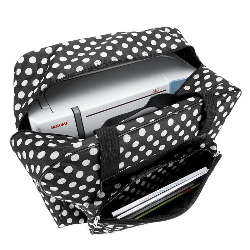Die Nähmaschinentasche bietet viel Platz für Ihre Maschine und das notwendige Zubehör. Die Maschine kann komplett eingefädelt in der Tasche untergebracht und sicher verstaut transportiert werden.