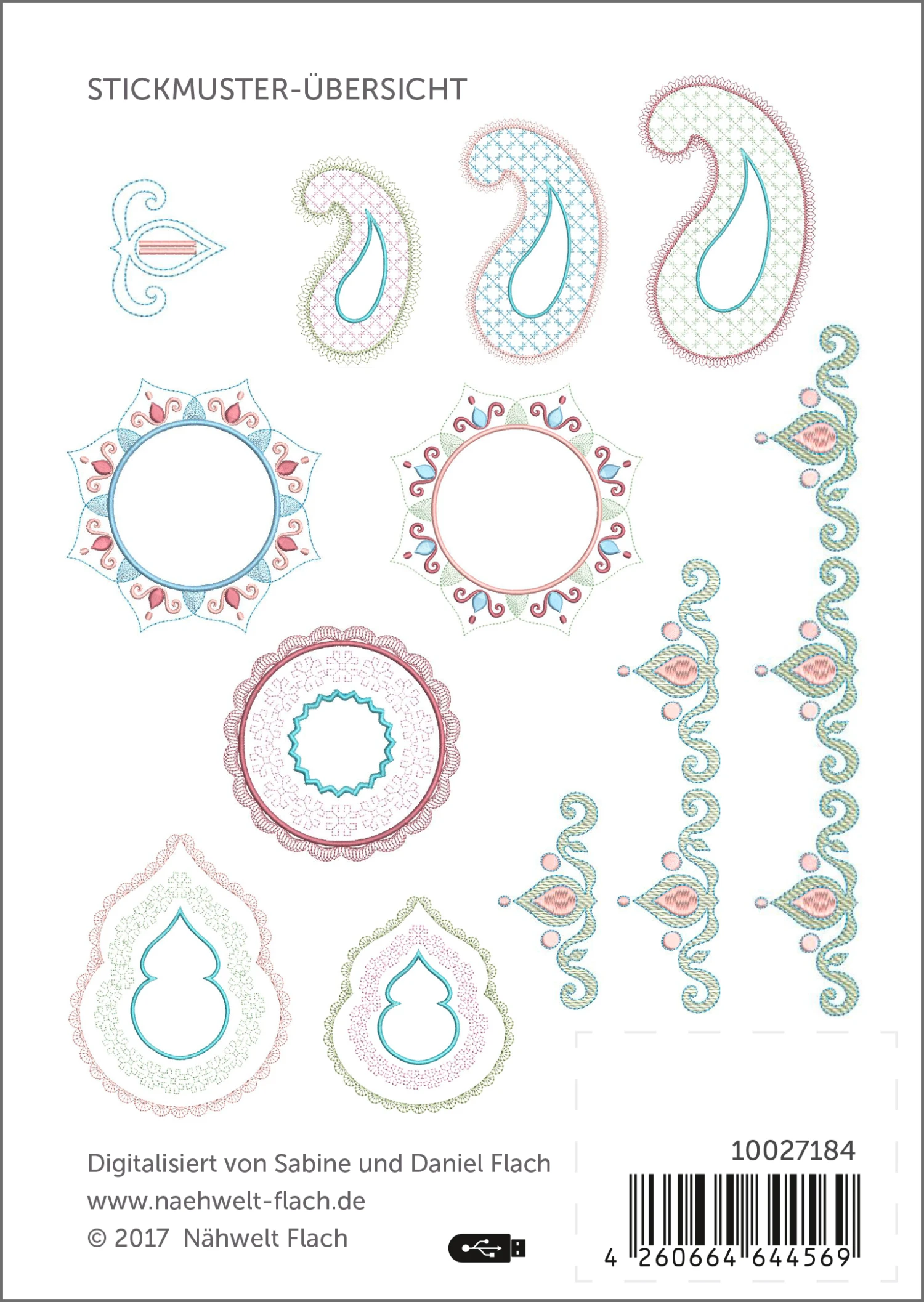 Verzaubern wie 1001 Nacht – mit diesen Stickmustern – mit orientalisch, ethnischen Mandala Ornamenten, floralen, geometrischen Mustern und Kreisen.