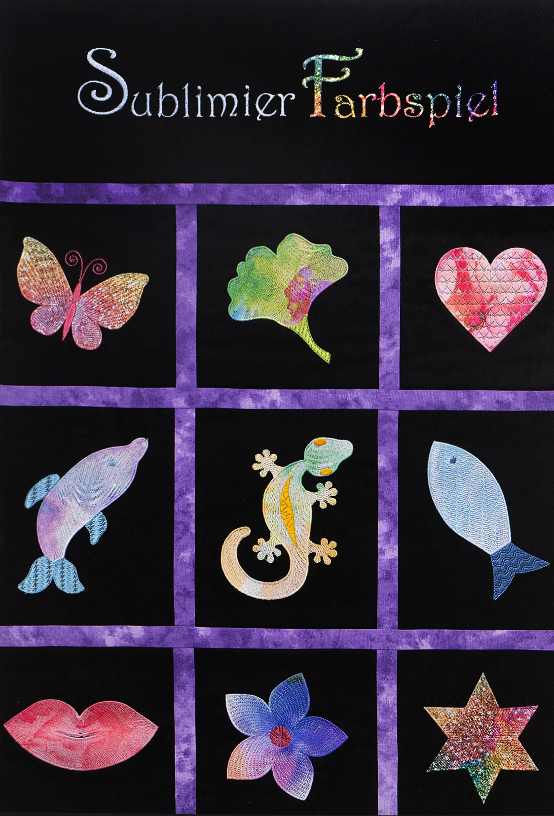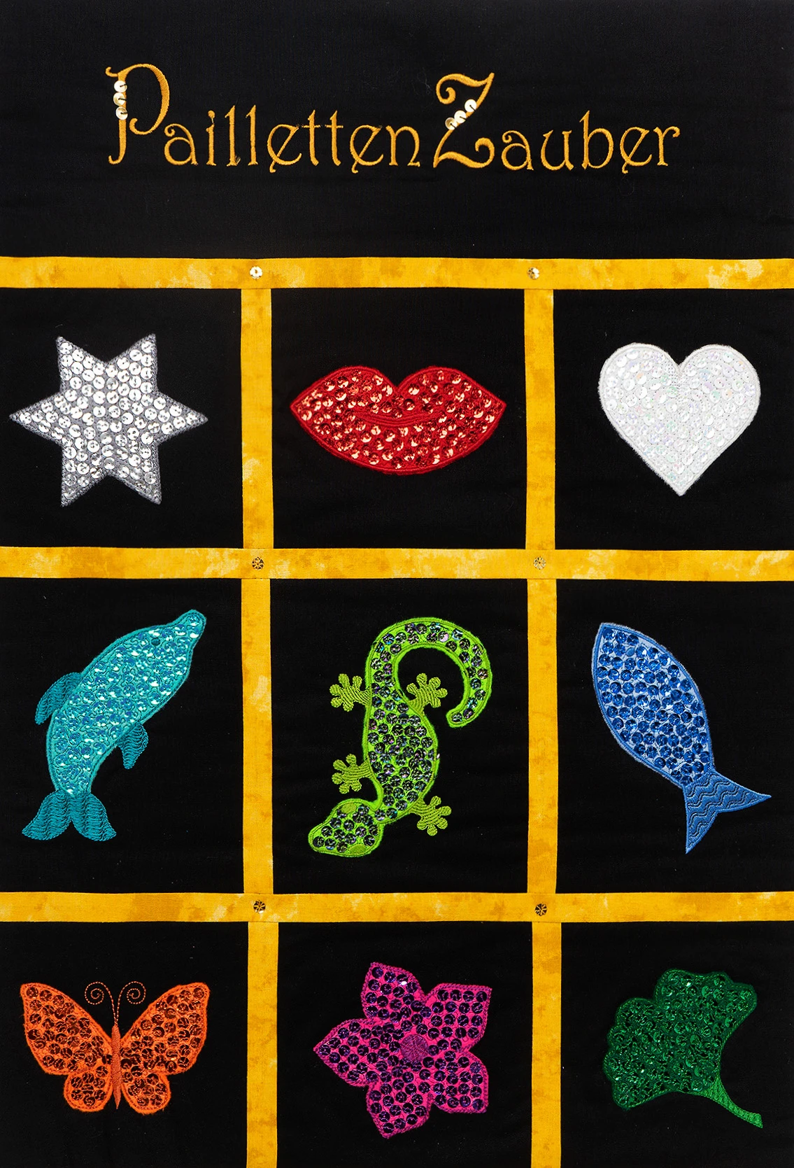 Jeweils 9 Stickmotive sind für die Pailletten Technik und das Sublimieren in den Formaten: .art, .exp, .jef, .pes und .vp3 enthalten.