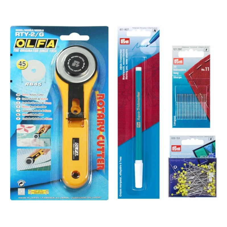 Mit diesem tollen Patchwork Starter Set von Olfa erhalten Sie den perfekten Einstieg in das Patchworken. Mit dem Zubehör Schneideunterlage, Rollschneider, Quilt Lineal, Glaskopfstecknadeln, Aqua Trickmarker und Nähnadeln, ist der Anfang schon gemacht.