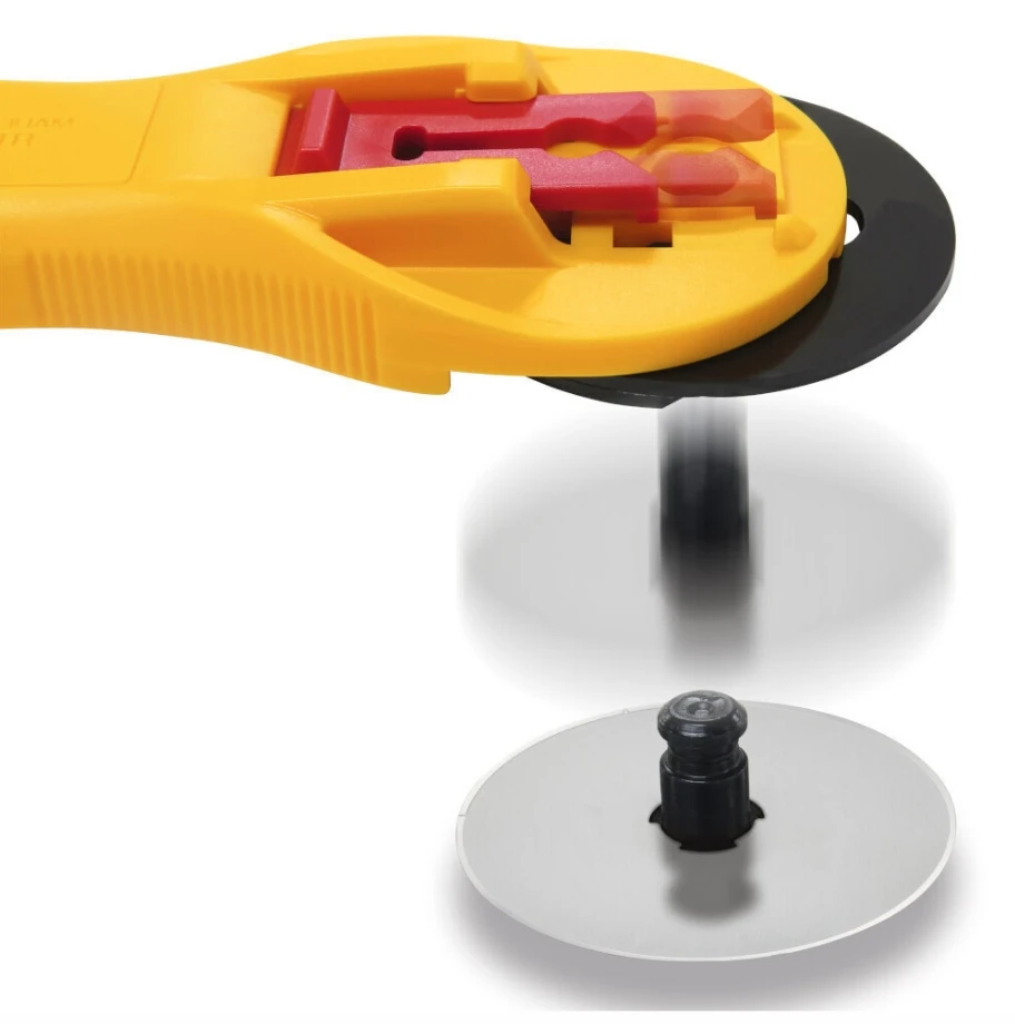 Beim neuen Rollschneider von Olfa kann die Klinge jetzt noch leichter und schneller getauscht werden. Einfach den Schieber auf der Griffrückseite nach unten ziehen, um die Klinge zu lösen. Kein lästiges Aufschrauben und Justieren, bis die Klinge wieder sitz.