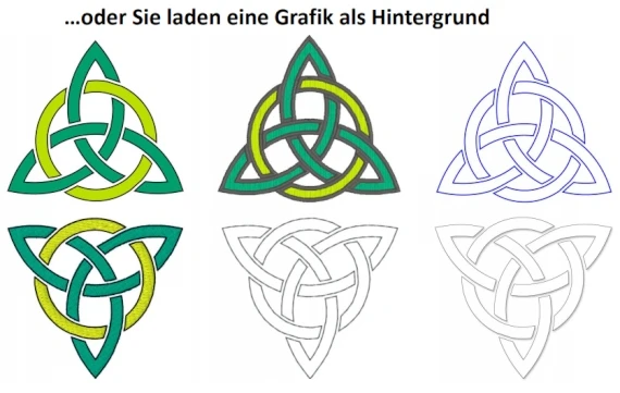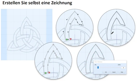 Es unterstützt Sie beim Erstellen von eigenen individuellen Designs. Sie zeichnen also Ihren Entwurf selbst, oder verwenden Grafiken. Vektorgrafiken (.svg) sind als Vorlage ladbar. Mit dieser Vorlage werden dann Stiche erstellt. Die Designs können ausgefüllt werden, oder es entsteht nur eine Konturumrandung, oder Sie erhalten ein Applikationsdesign. Diese Applikationselemente, also der Teil der später im Projekt mit Stoff gestaltet wird, kann auch zu Cuttergeräten geschickt werden.