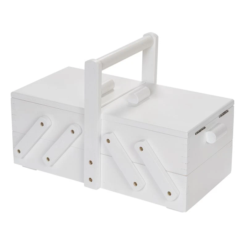 Dieser Nähkasten aus Holz hat es in sich, wenn es um die übersichtliche Ordnung rund um das Nähzubehör geht. Das klassische und bewährte Ziehharmonika-Prinzip bietet vielfältigen Stauraum auf mehreren Ebenen.