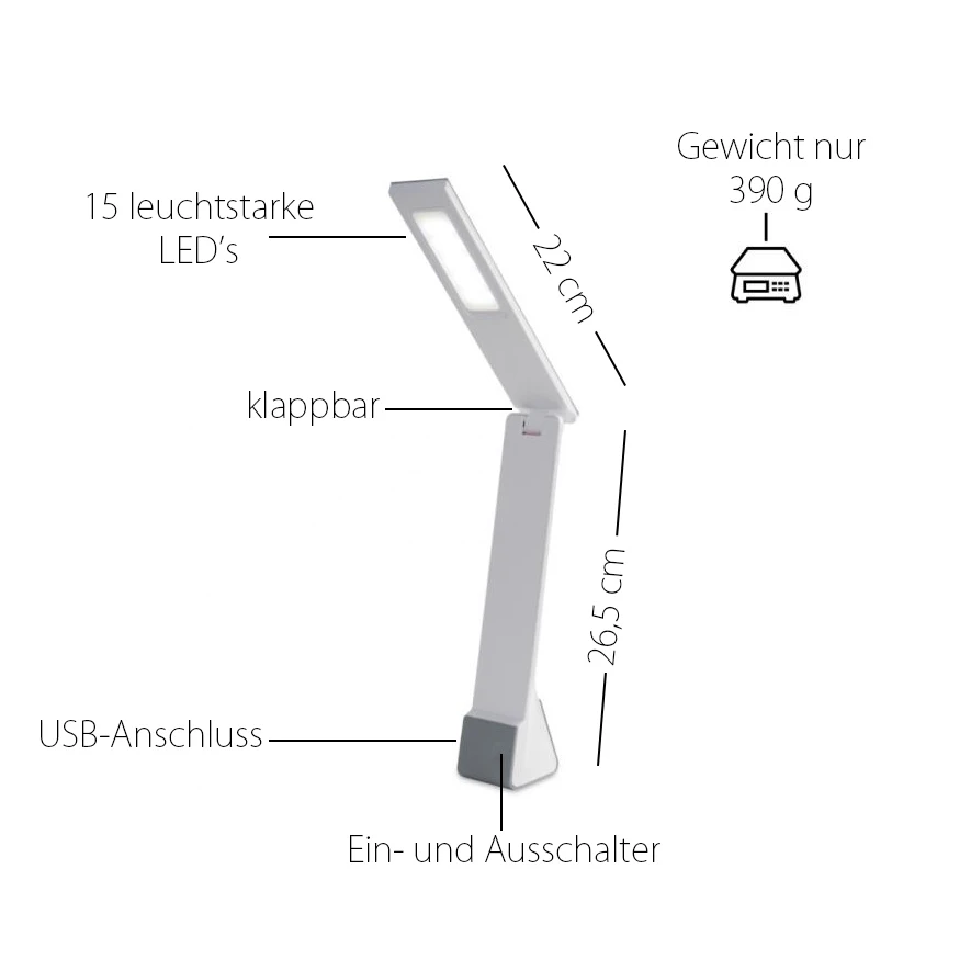 Die Bedienung erfolgt über einen Sensor-Lichtregler im Standfuß. Betrieben wird sie entweder über den USB-Anschluss oder auch mit Batterien.