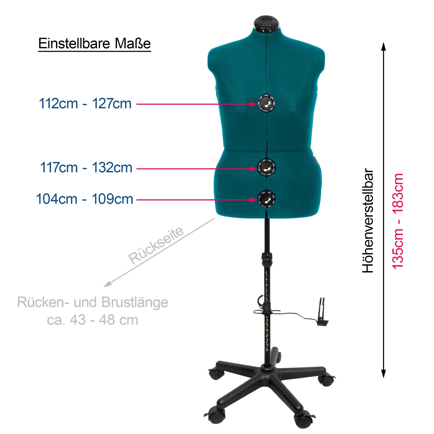 DETAILS: Höhenverstellbar 135 cm – 183 cm, Einstellbare Maße: Brustumfang 112 cm – 127 cm, Taille 104 cm – 109 cm, Hüfte 117 cm – 132 cm, Rücken- und Brustlänge ca. 43 – 48 cm |