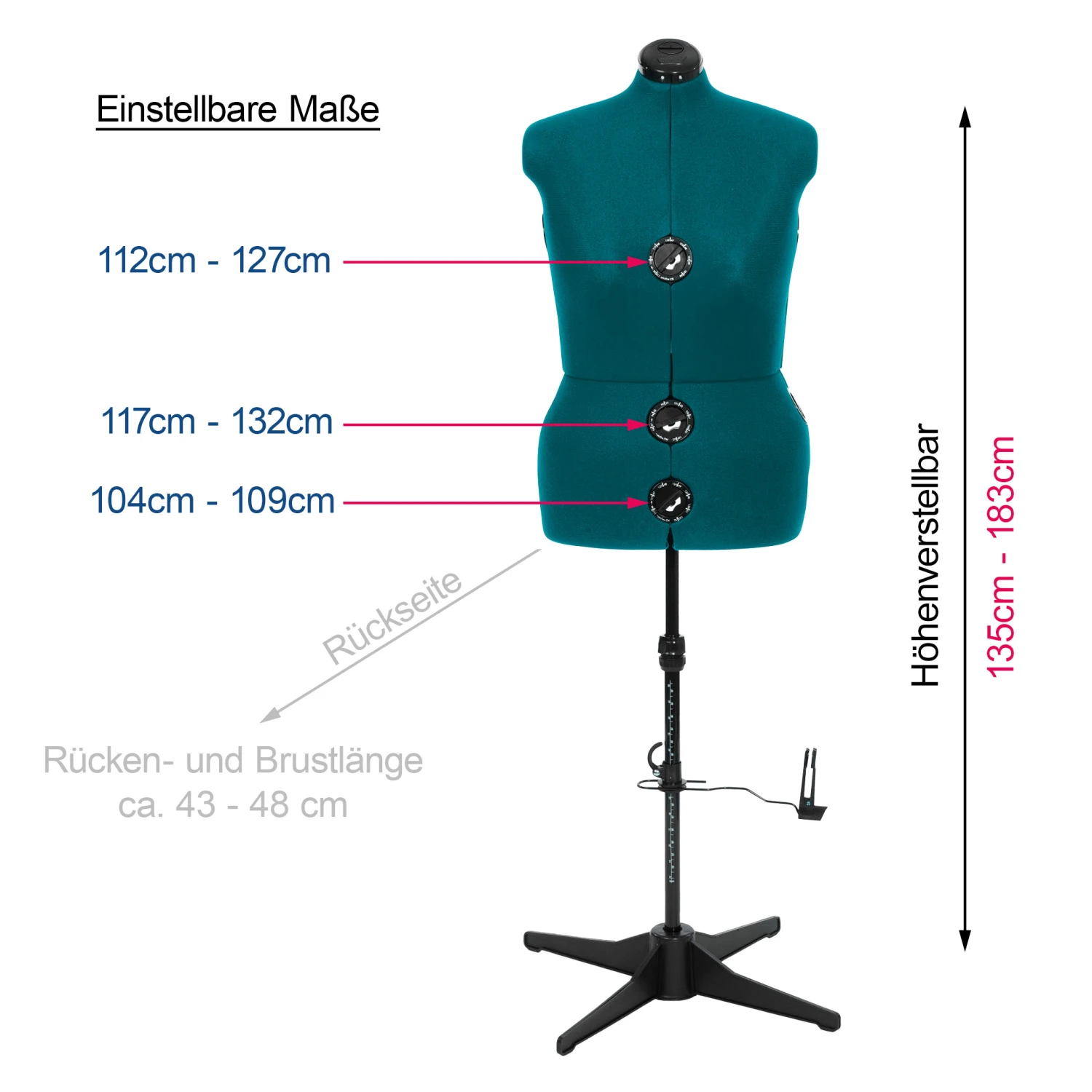 DETAILS: Höhenverstellbar 135 cm – 183 cm, Einstellbare Maße: Brustumfang 112 cm – 127 cm, Taille 104 cm – 109 cm, Hüfte 117 cm – 132 cm, Rücken- und Brustlänge ca. 43 – 48 cm |