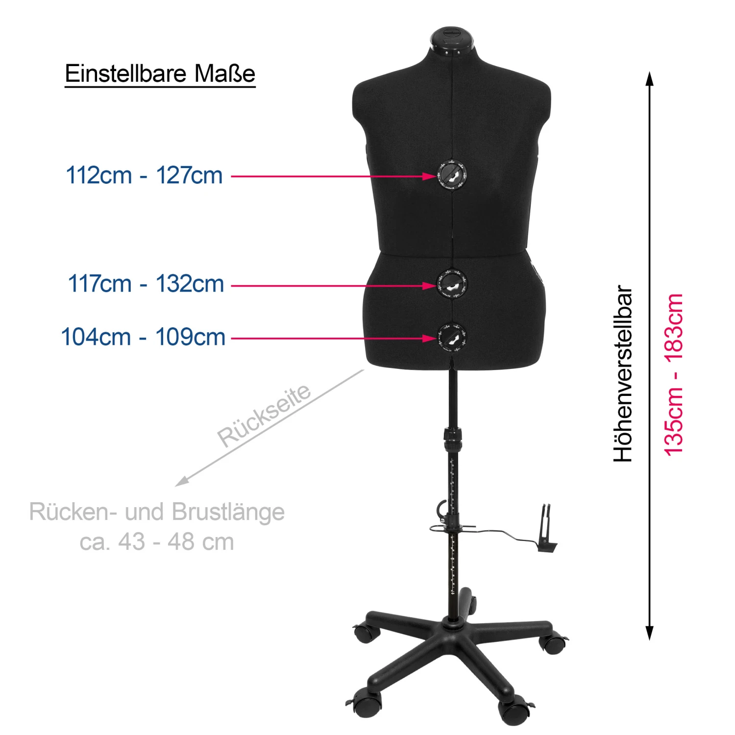 DETAILS: Höhenverstellbar 135 cm – 183 cm, Einstellbare Maße: Brustumfang 112 cm – 127 cm, Taille 104 cm – 109 cm, Hüfte 117 cm – 132 cm, Rücken- und Brustlänge ca. 43 – 48 cm |