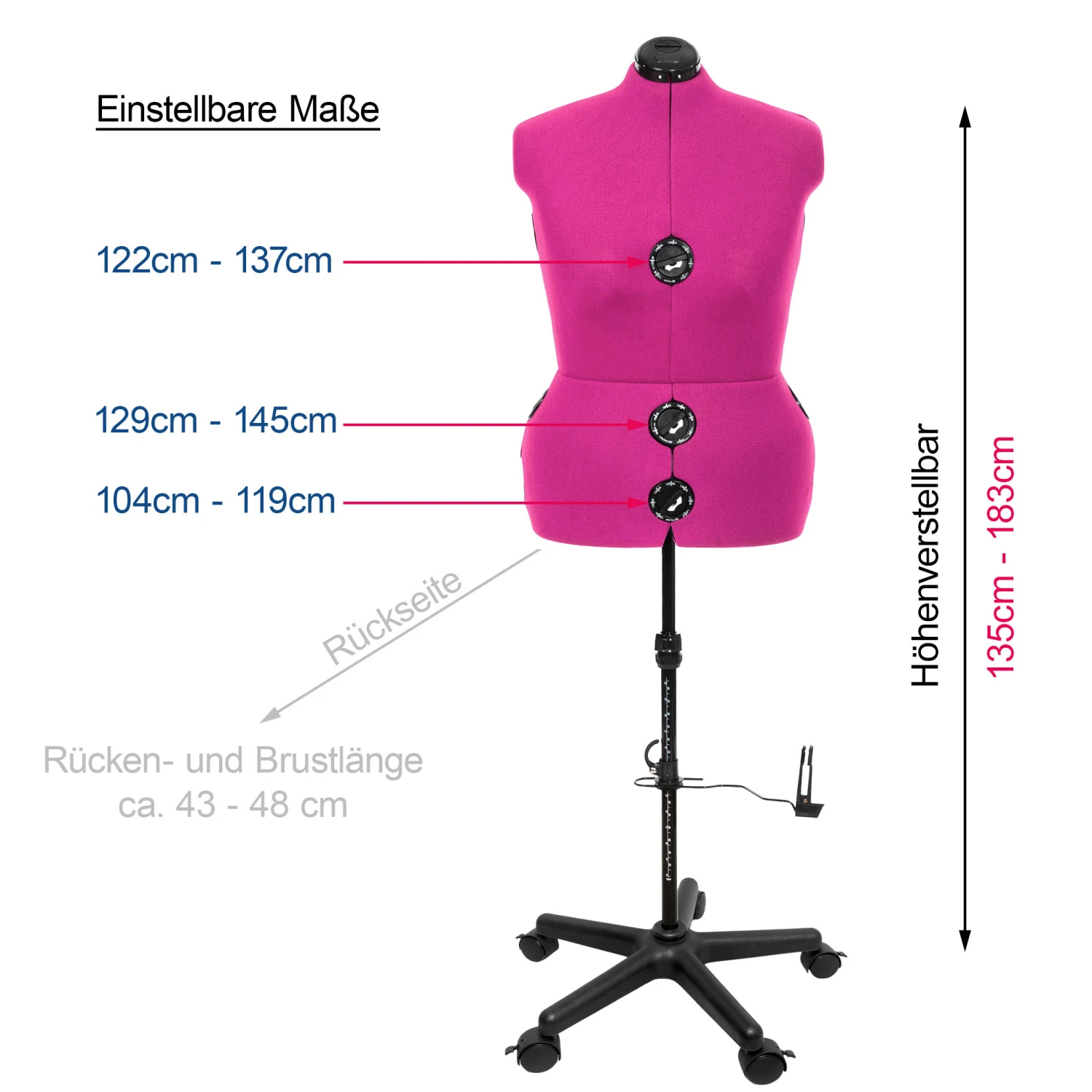 PRAKTISCH: mit 13 Einstellrädern individuell verstellbar an Hals, Taille, Brust und Hüfte, perfekt auch für unterschiedliche Personen/ Kunden/ Freundin oder Familie einsetzbar, integriertes Nadelkissen im Halsbereich, Rockabmesser mit Stecknadelfixierung. |