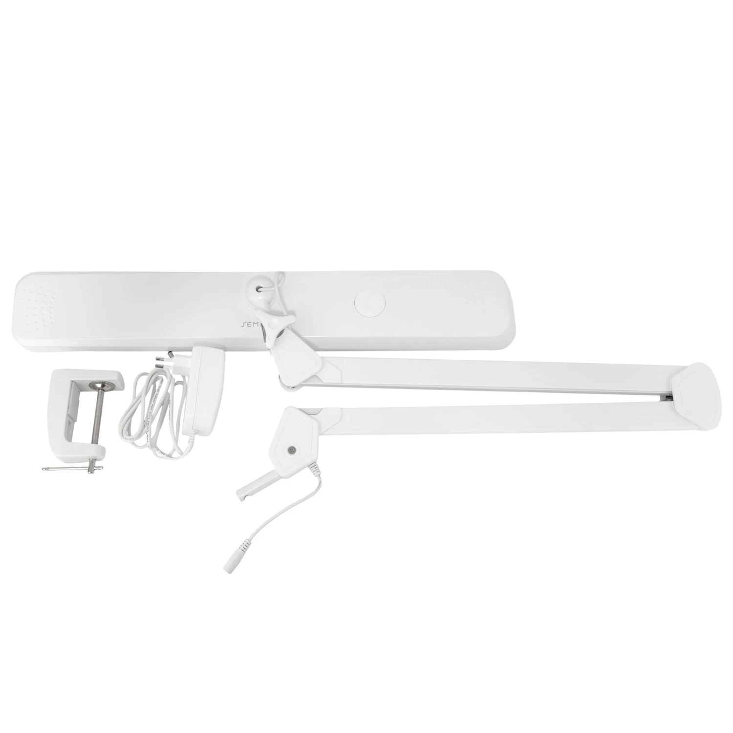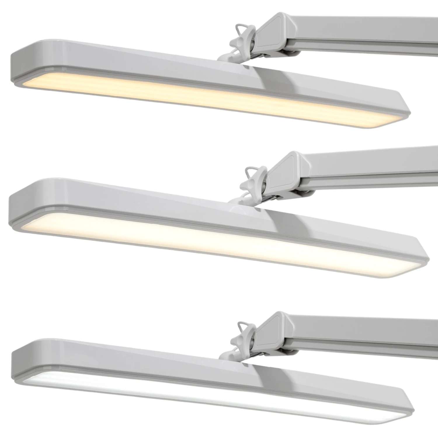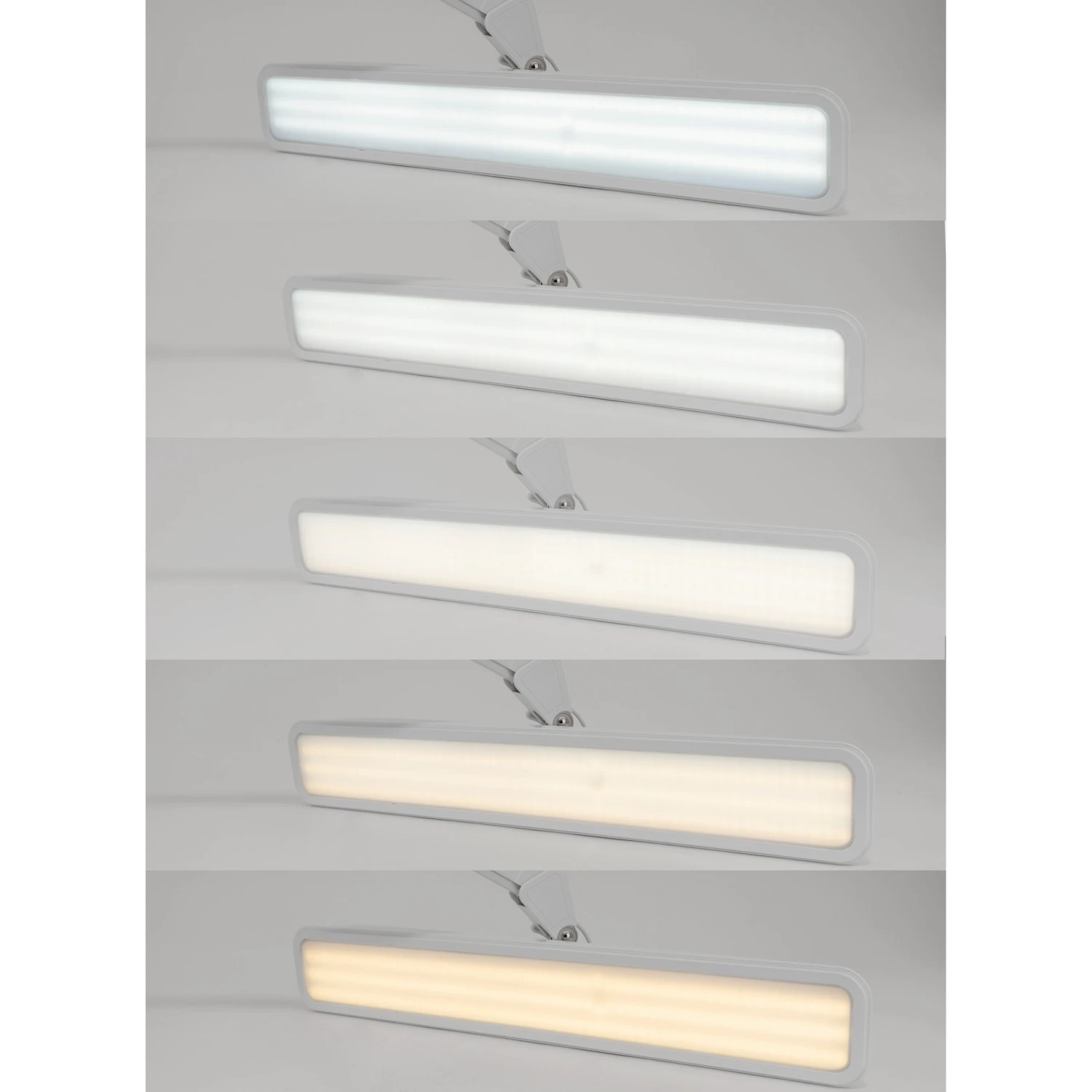 EIGENSCHAFTEN: Mit Tischklemme, schraubbar, für Tischplatten bis zu einer Stärke von 6 cm geeignet. Maße des Leuchtkörpers: 560 mm x 90 mm, 324 LEDs, Lichtfarbe in 5 Stufen einstellbar, jede Farbe individuell dimmbar, 2500 Lumen, AC100-240 V~50/60 Hz, 30 Watt, Lebensdauer bis 50000 h, Netzkabel
