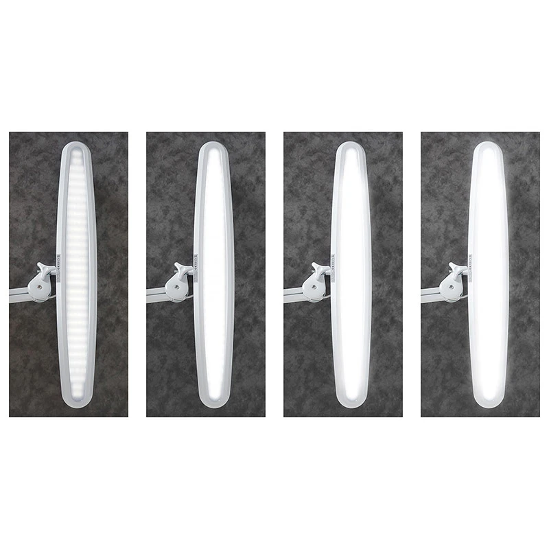 EIGENSCHAFTEN: Mit Tischklemme, schraubbar, für Tischplatten bis zu einer Stärke von 6 cm geeignet. Maße des Leuchtkörpers: 580 mm x 90 mm, 117 LEDs, individuell dimmbar, Tageslicht 6000 Kelvin, 2200 Lumen, AC100 – 240 Volt~50 Hz, 24 Watt, Lebensdauer bis 40000 h, 1,45 m Netzkabel