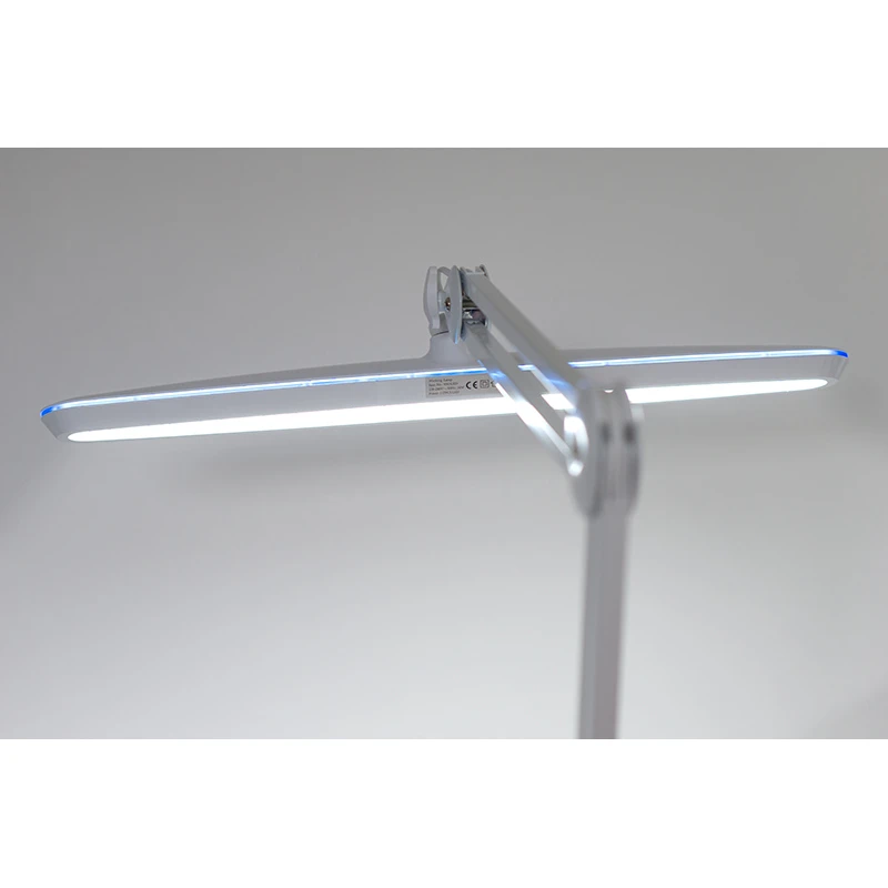 EIGENSCHAFTEN: Maße: Tischstandfuß: Ø 25 cm, 6 kg, Tischklemme für Tischplatten bis zu einer Stärke von 70 mm, Maße des Leuchtkörpers: 580 mm x 90 mm, 117 LEDs, individuell dimmbar, Tageslicht 6000 Kelvin, 2200 Lumen, AC100 – 240 Volt ~50 Hz, 24 Watt, Lebensdauer bis 40000 h, 1,45 m Netzkabel