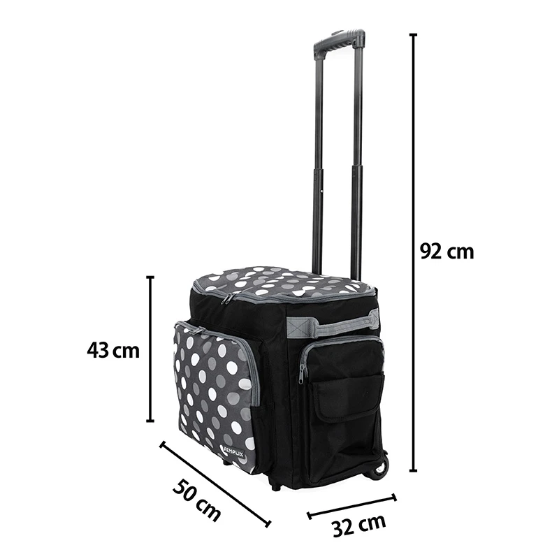 DETAILS: Trolley Außen-Maße inkl. Rollen und Außentaschen (BxHxT): 50 x 43 x 32 cm, Hauptfach-Innenmaße für Nähmaschine: ca.40 x 32 x 20 cm, Frontfach: 34 x 27 x 4,5 cm mit 2-Wege-RV, seitlich je 1 RV-Fach ca.18 x 26 x 2,5 cm, darauf je 1 Steckfach ca.18 x 19 cm