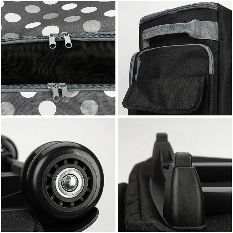 PRAKTISCH: Der komplett zu öffnende Deckel des Trolleys, durch einen klemmfreien 2-Wege-Reißverschluß, ermöglicht leichtes Einpacken und Entnehmen, auch für etwas sperrigere Nähmaschinen, inklusive Pedal und Kabel. Ein zusätzliches, großes, aufgesetztes Fach mit 2-Wege-RV, bietet genügend Raum für Zubehör und Kleinteile wie z.B. Kabel, Garnrollen, Reißverschlüsse, Nadeln. Zwei breite Rollen ermöglichen einen bequemen Transport. Mit der stabilen Teleskopstange mit breitem Griff, lässt sich der Trolley leicht und komfortabel „manövrieren“. Ein fester, solide verarbeiteter Boden mit zwei Kunststoff-Standfüßen sorgt für einen sicheren Stand.