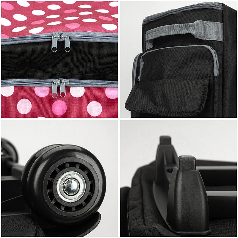 PRAKTISCH: Der komplett zu öffnende Deckel des Trolleys, durch einen klemmfreien 2-Wege-Reißverschluß, ermöglicht leichtes Einpacken und Entnehmen, auch für etwas sperrigere Nähmaschinen, inklusive Pedal und Kabel. Ein zusätzliches, großes, aufgesetztes Fach mit 2-Wege-RV, bietet genügend Raum für Zubehör und Kleinteile wie z.B. Kabel, Garnrollen, Reißverschlüsse, Nadeln. Zwei breite Rollen ermöglichen einen bequemen Transport. Mit der stabilen Teleskopstange mit breitem Griff, lässt sich der Trolley leicht und komfortabel „manövrieren“. Ein fester, solide verarbeiteter Boden mit zwei Kunststoff-Standfüßen sorgt für einen sicheren Stand.
