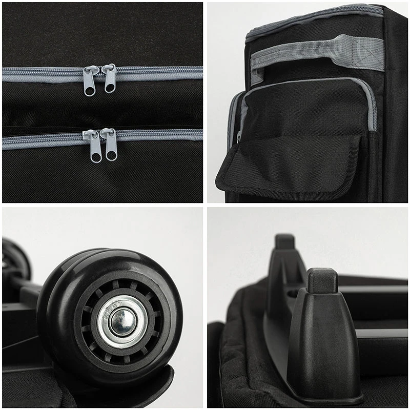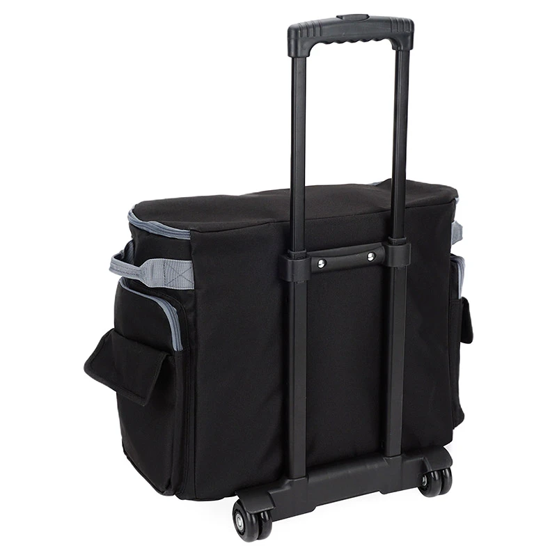STABIL: strapazierfähiger, abwaschbarer und gefütterter Außenstoff zum Schutz der wertvollen Maschine / innen Befestigungsgurt zum Stabilisieren der Maschine, Teleskop-Trolleygestänge (Höhe max. 92 cm), stabile, leichtgängig gelagerte Doppel-Gummirollen