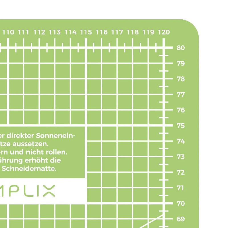 KONTRASTREICHE weiß gedruckte Skalen und Linien sind besonders gut durch transparente Lineale zu erkennen und erleichtern somit das schnelle Maßnehmen und Anlegen beim Schneiden. Die bereits aufgedruckten Hilfslinien in den gängigsten Winkeln sind zum Zuschneiden von vielen Patchwork Formen und bei Bastelarbeiten sehr hilfreich. |