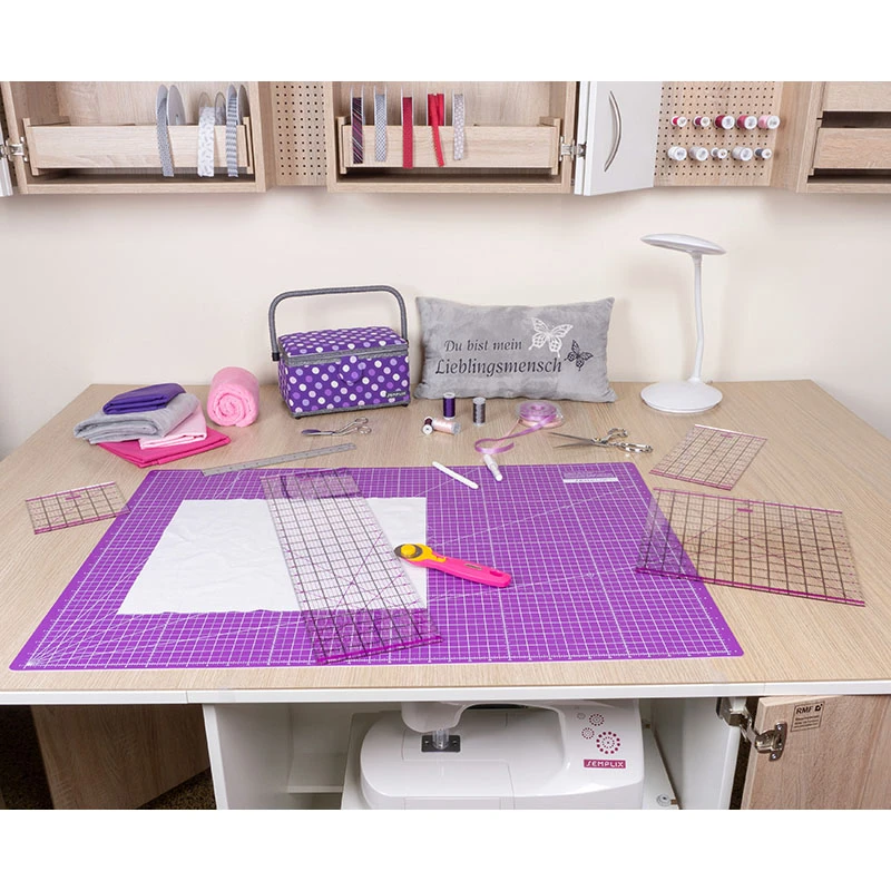 QUALITÄT: Das 3-lagige, stabile und selbstheilende Material der Matte schützt Arbeitstisch und Klinge, hat ein niedriges Gewicht und ist langlebig. Die seidenmatte Oberfläche ohne störende Glanzstellen sorgt dafür, dass der darauf liegende Stoff deutlich weniger rutscht.