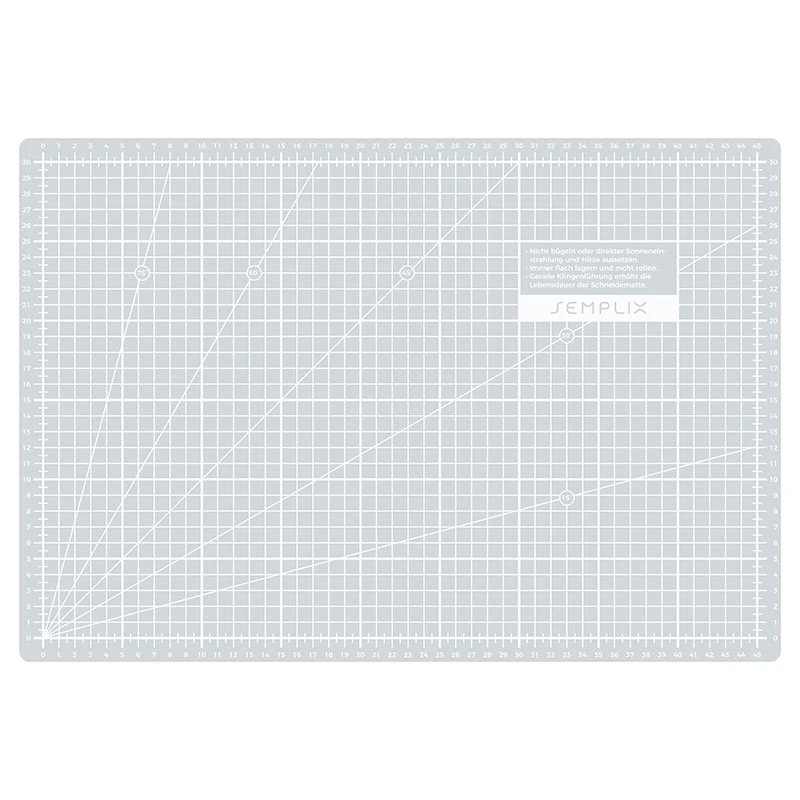 DAS BESONDERE an der Semplix-Schneidematte ist die Randzugabe. Sie sorgt dafür, dass die volle Skala von 45 x 30 cm / 18 x 12 inch komplett genutzt werden kann. Die über das Raster hinaus reichenden, umlaufenden Markierungen, ermöglichen das passgenaue Anlegen und Schneiden direkt am Rand.