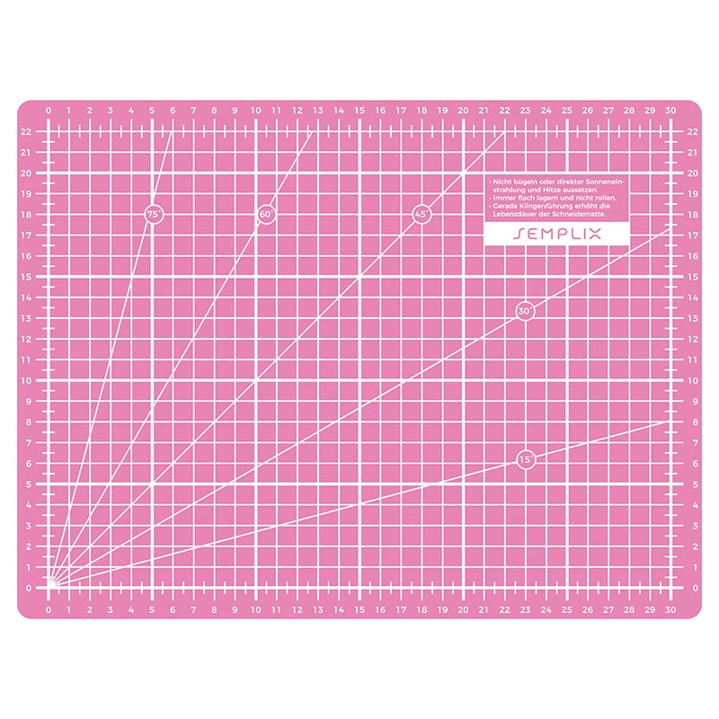 KONTRASTREICHE weiß gedruckte Skalen und Linien sind besonders gut durch transparente Lineale zu erkennen und erleichtern somit das schnelle Maßnehmen und Anlegen beim Schneiden. Die bereits aufgedruckten Hilfslinien in den gängigsten Winkeln sind zum Zuschneiden von vielen Patchwork Formen und bei Bastelarbeiten sehr hilfreich.