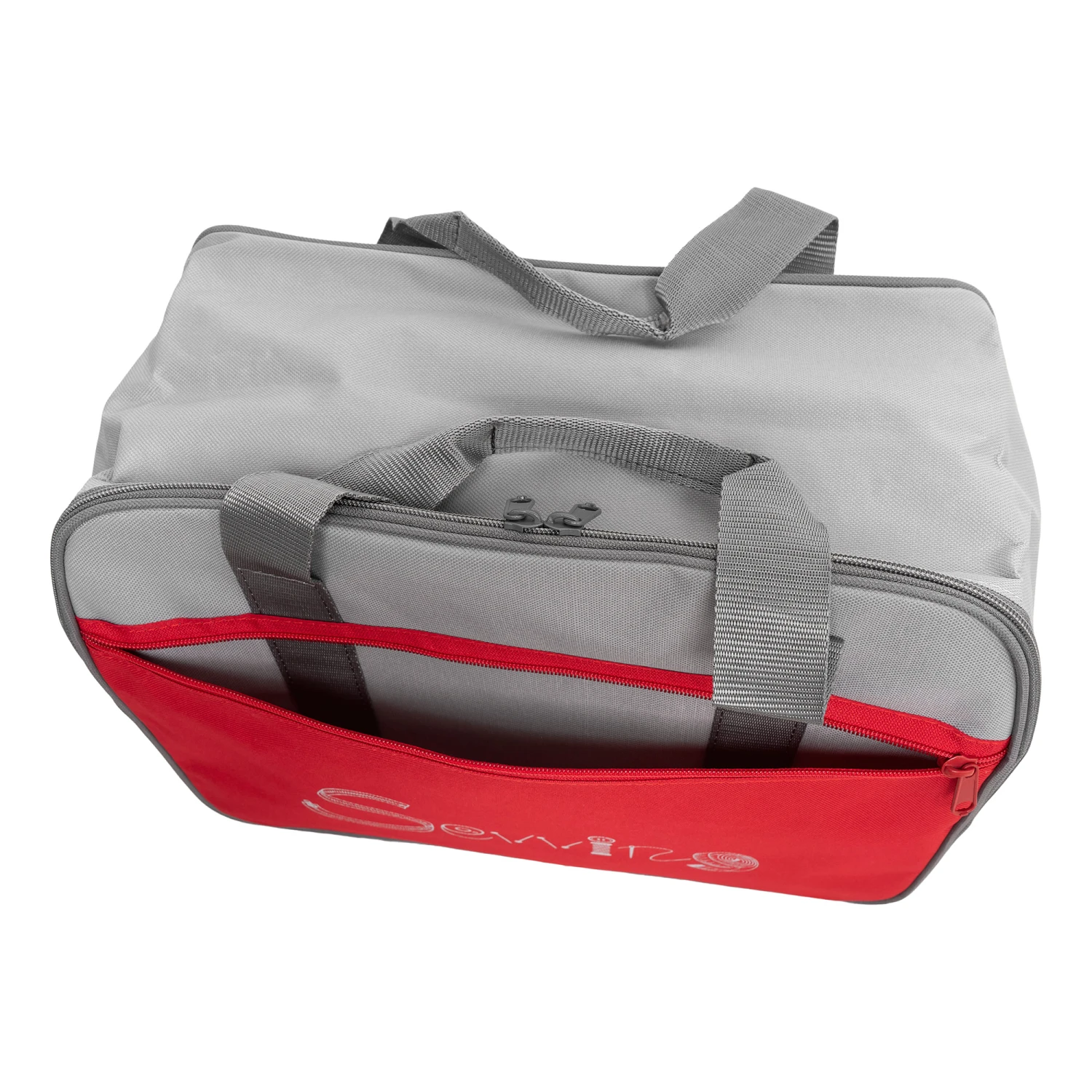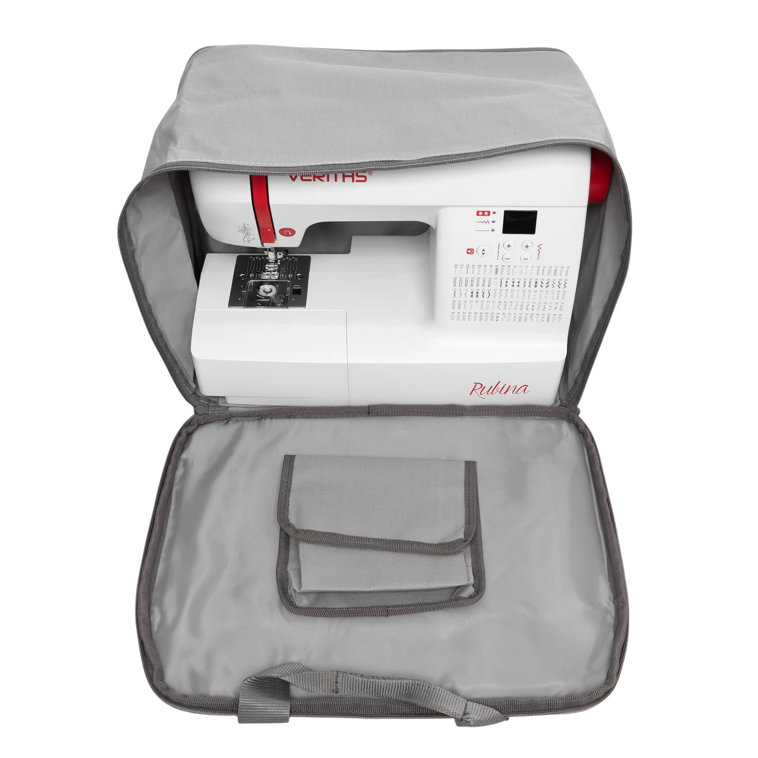 In die schöne Nähmaschinentasche in grau, mit Akzenten im typischem VERITAS rot, mit aufgesticktem „Sewing-Lable“ auf der Außentasche.